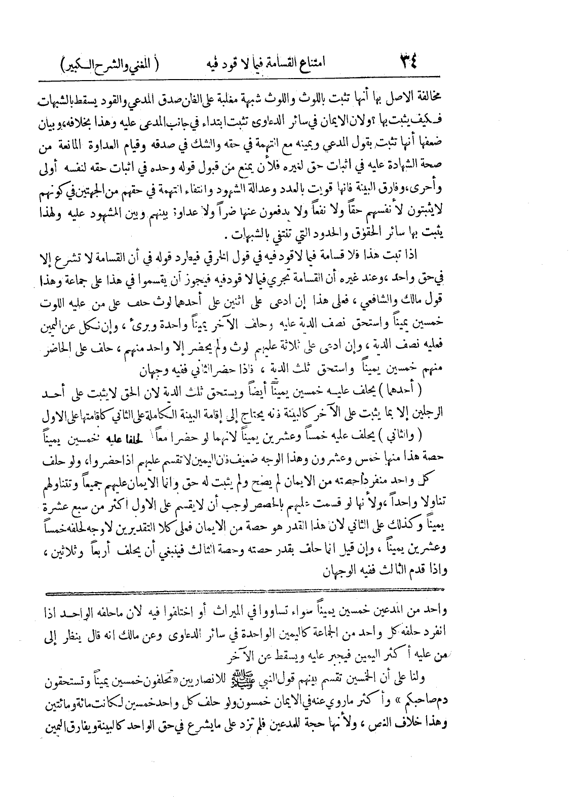 واحد من المدعين خمسين يميناً سواء تساووا في الميراث أو اختلفوا فيه لأن ما حلفه الواحد إذا انفرد حلفه كل واحد من الجماعة كاليمين الواحدة في سائر الدعاوي وعن مالك أنه قال ينظر إلى من عليه أكثر اليمين فيجبر عليه ويسقط عن الآخر ولنا على أن الخمسين تقسم بينهم قول النبي صلى الله عليه وسلم للانصاريين (تحلفون خمسين يميناً وتستحقون دم صاحبكم) وأكثر ماروي عنه في الأيمان خمسون ولو حلف كل واحد خمسين لكانت مائة ومائتين وهذا خلاف النص، ولأنها حجة للمدعين فلم تزد على ما يشرع في حق الواحد كالبينة ويفارق اليمين
