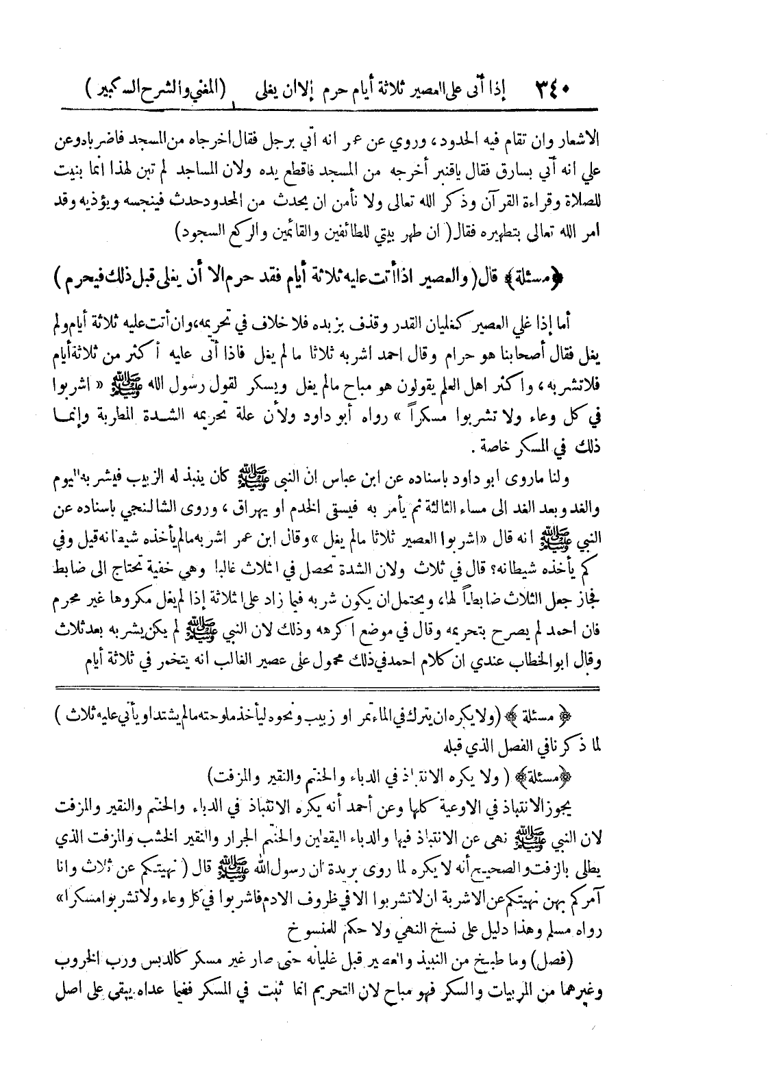 (مسألة) (ولا يكره أن يترك في الماء تمر أو زبيب ونحوه ليأخذ ملوحته ما لم يشتد أو يأتي عليه ثلاث لما ذكرنا في الفصل الذي قبله (مسألة) (ولا يكره الانتباذ في الدباء والختم (والحنتم) والنقير والمزفت) يجوز الانتباذ في الأوعية كلها وعن أحمد أن يكره الانتباذ في الدباء والختم (والحنتم) والنقير والمزفت