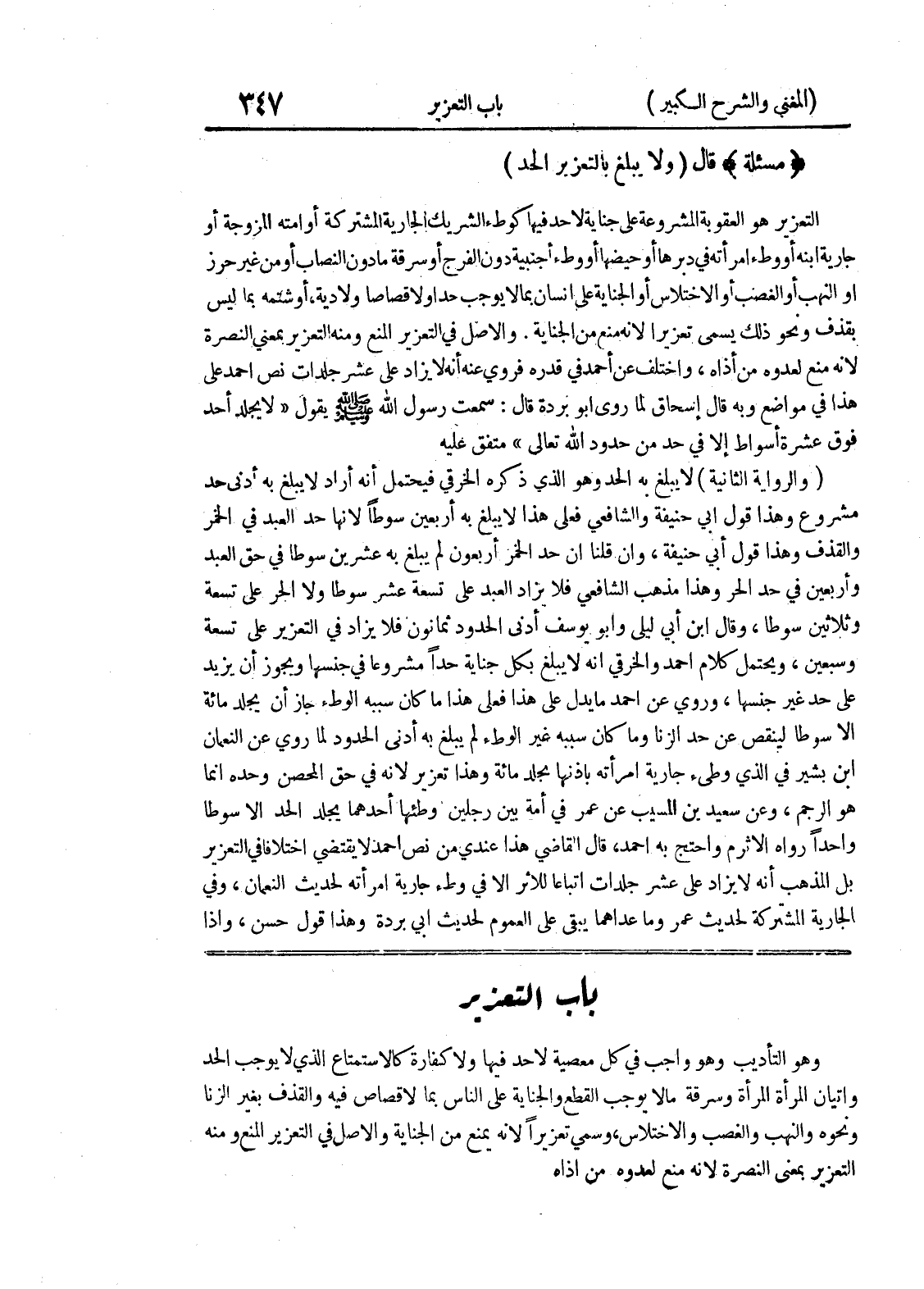 باب التعزير وهو التأديب وهو واجب في كل معصية لاحد فيها ولا كفارة كالاستمتاع الذي لا يوجب الحد واتيان المرأة المرأة وسرقة مالا يوجب القطع والجناية على الناس بما لاقصاص فيه والقذف بغير الزنا ونحوه والنهب والغصب والاختلاس، وسمي تعزيراً لأنه يمنع من الجناية والأصل في التعزير المنع ومنه التعزير بمعنى النصرة لأنه منع لعدوه من أذاه