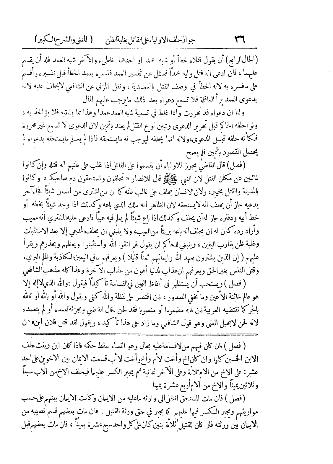 (فصل) فإن كان فيهم من لاقسامة عليه بحال وهو النساء سقط حكمه فإذا كان ابن وبنت حلف الابن الخمسين كلها وان كان أخ وأخت لأم وأخ وأخت لأب قسمت الأيمان بين الأخوين على احد عشر: على الأخ من الأم ثلاثة وعلى الآخر ثمانية ثم يجبر الكسر عليهما فيحلف الأخ من الأب سبعاً وثلاثين يميناً والأخ من الأم أربع عشرة يميناً (فصل) فإن مات المستحق انتقل إلى وارثه ما عليه من الأيمان وكانت الايمان بينهم على حسب مواريثهم ويجبر الكسر فيها عليهم كما يجبر في حق ورثة القتيل.