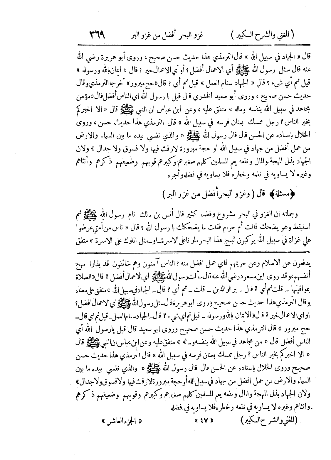 وقال الترمذي هذا حديث حسن صحيح وروى أبو هريرة قال سئل رسول الله صلى الله عليه وسلم أي الاعمال افضل؟ اواي الأعمال خير؟ قال (الإيمان بالله ورسوله - قيل ثم أي شئ؟ قال - الجهاد سنام العمل - قيل ثم أي قال - حج مبرور) قال الترمذي هذا حديث حسن صحيح وروى أبو سعيد قال قيل يا رسول الله أي الناس أفضل قال (من يجاهد في سبيل الله بنفسه وماله) متفق عليه وعن ابن عباس أن النبي صلى الله عليه وسلم قال (ألا أخبركم بخير الناس؟ رجل ممسك بعنان فرسه في سبيل الله) قال الترمذي هذا حديث حسن صحيح وروى الخلال بإسناده عن الحسن قال قال رسول الله صلى الله عليه وسلم (والذي نفسي بيده مابين السماء والأرض من عمل أفضل من جهاد في سبيل الله أو حجة مبرورة لارفث فيها ولافسوق ولا جدال) ولأن الجهاد بذل المهجة والمال ونفعه يعم المسلمين كلهم صغيرهم وكبيرهم وقويهم وضعيفهم ذكرهم وأنثاهم وغيره لا يساويه في نفعه وخطره فلا يساويه في فضله