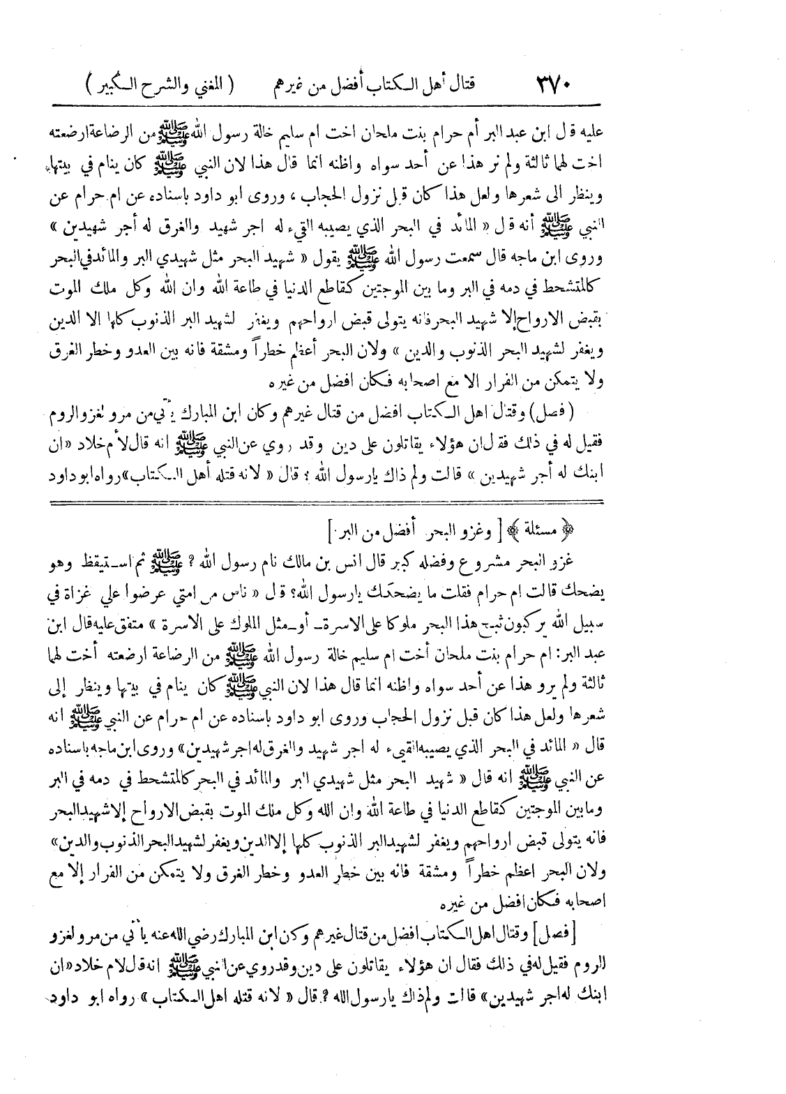 (مسألة) [وغزو البحر أفضل من البر] غزو البحر مشروع وفضله كبير قال أنس بن مالك نام رسول الله؟ صلى الله عليه وسلم ثم استيقظ وهو يضحك قالت أم حرام فقلت ما يضحكك يارسول الله؟ قال (ناس من أمتي عرضوا علي غزاة في سبيل الله يركبون ثبح هذا البحر ملوكاً على الأسرة - أو - مثل الملوك على الأسرة) متفق عليه قال ابن عبد البر: أم حرام بنت ملحان أخت أم سليم خالة رسول الله صلى الله عليه وسلم من الرضاعة أرضعته أخت لهما ثالثة ولم يرو هذا عن أحد سواه وأظنه إنما قال هذا لأن النبي صلى الله عليه وسلم كان ينام في بيتها وينظر إلى شعرها ولعل هذا كان قبل نزول الحجاب وروى أبو داود باسناده عن أم حرام عن النبي صلى الله عليه وسلم أنه قال (المائد في البحر الذي يصيبه القئ له أجر شهيد والغرق له أجر شهيدين) وروى ابن ماجة بإسناده عن النبي صلى الله عليه وسلم أنه قال (شهيد البحر مثل شهيدي البر والمائد في البحر كالمتشحط في دمه في البر وما بين الموجتين كقاطع الدنيا في طاعة الله وإن الله وكل ملك الموت بقبض الأرواح إلا شهيد البحر فإنه يتولى قبض أرواحهم ويغفر لشهيد البر الذنوب كلها إلا الدين ويغفر لشهيد البحر الذنوب والدين) ولأن البحر اعظم خطراومشقة فإنه بين خطر العدو وخطر الغرق ولا يتمكن من الفرار إلا مع