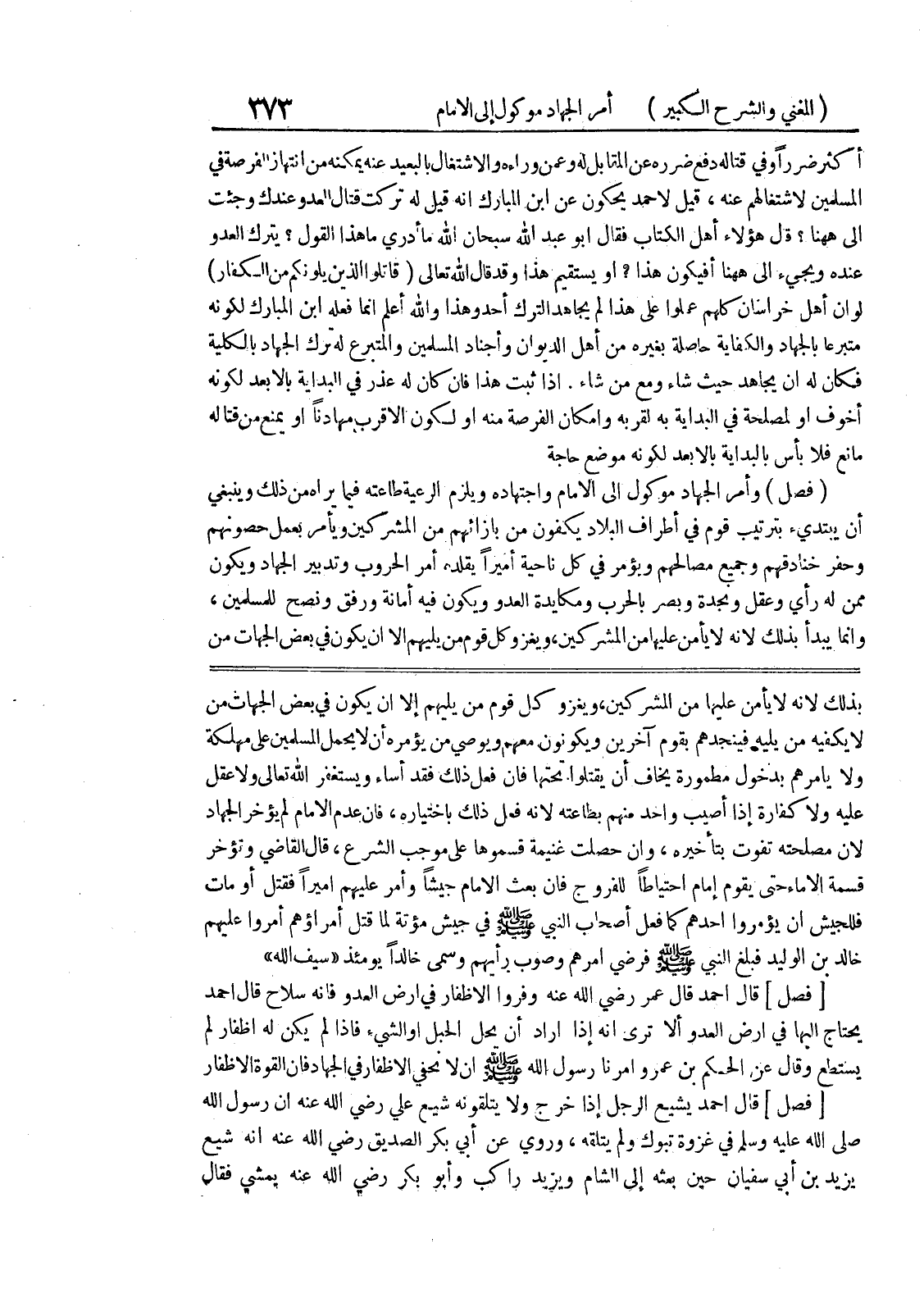 بذلك لأنه لا يأمن عليها من المشركين، ويغزو كل قوم من يليهم إلا أن يكون في بعض الجهات من لا يكفيه من يليه فينجدهم بقوم آخرين ويكونون معهم ويوصي من يؤمره أن لا يحمل المسلمين على مهلكة ولا يأمرهم بدخول مطمورة يخاف أن يقتلوا تحتها فان فعل ذلك فقد أساء ويستغفر الله تعالى ولا عقل عليه ولا كفارة إذا أصيب واحد منهم بطاعته لأنه فعل ذلك باختياره، فإن عدم الإمام لم يؤخر الجهاد لأن مصلحته تفوت بتأخيره، وإن حصلت غنيمة قسموها على موجب الشرع، قال القاضي وتؤخر قسمه الإماء حتى يقوم إمام احتياطاً للفروج فإن بعث الإمام جيشاً وأمر عليهم أميراً فقتل أو مات فللجيش أن يؤمروا أحدهم كما فعل أصحاب النبي صلى الله عليه وسلم في جيش مؤتة لما قتل أمراؤهم أمروا عليهم خالد بن الوليد فبلغ النبي صلى الله عليه وسلم فرضي أمرهم وصوب رأيهم وسمى خالداً يومئذ (سيف الله) [فصل] قال أحمد قال عمر رضي الله عنه وفروا الأظفار في أرض العدو فإنه سلاح قال أحمد
