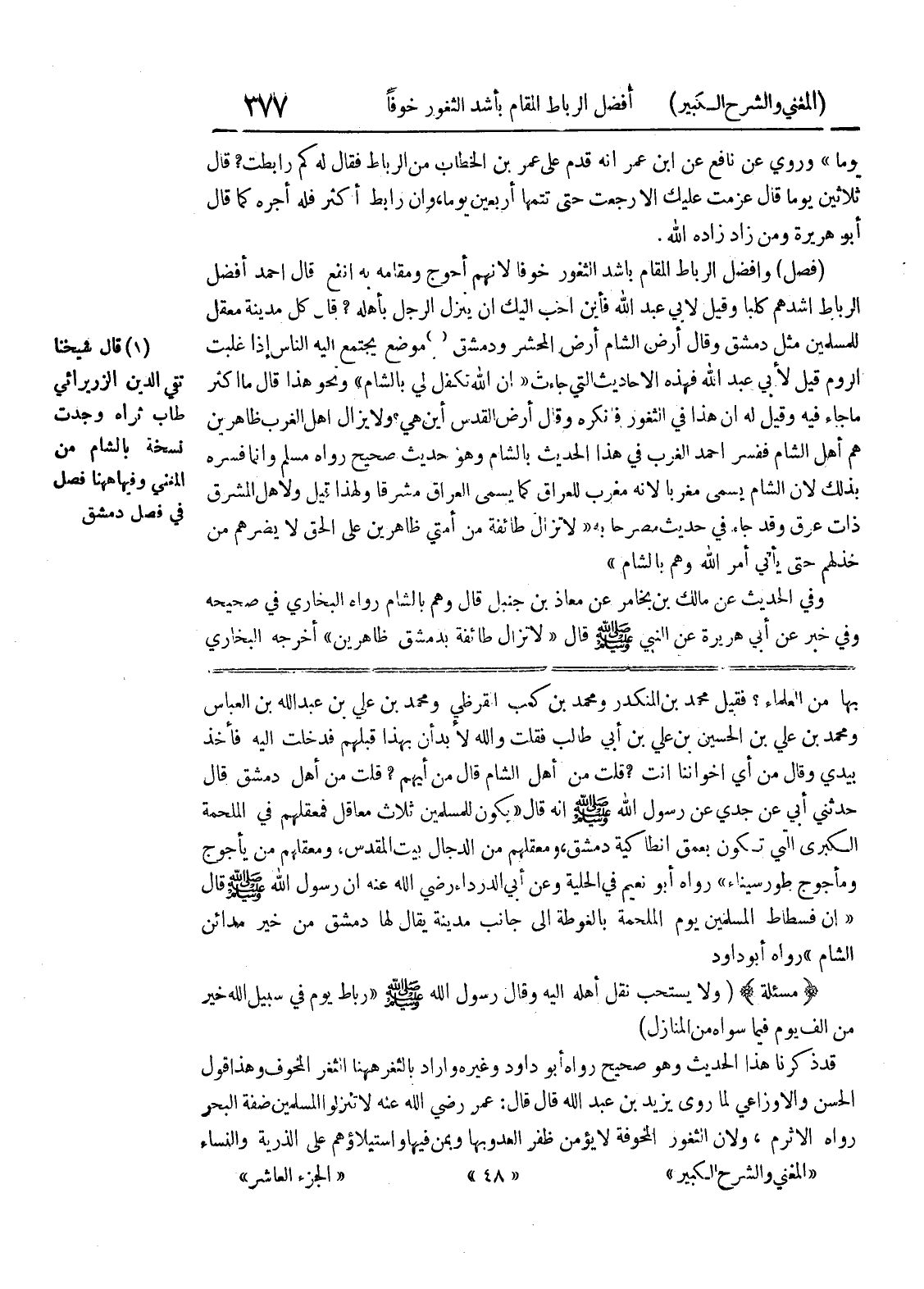 بها من العلماء؟ فقيل محمد بن المنكدر ومحمد بن كعب القرظي ومحمد بن علي بن عبد الله بن العباس ومحمد بن علي بن الحسين بن علي بن أبي طالب فقلت والله لأبدأن بهذا قبلهم فدخلت إليه فأخذ بيدي وقال من أي إخواننا أنت؟ قلت من أهل الشام قال من أيهم؟ قلت من أهل دمشق قال حدثني أبي عن جدي عن رسول الله صلى الله عليه وسلم أنه قال (يكون للمسلمين ثلاث معاقل فمعقلهم في الملحمة الكبرى التي تكون بعمق أنطاكية دمشق، ومعقلهم من الدجال بيت المقدس، ومعقلهم من يأجوج ومأجوج طور سيناء)) رواه أبو نعيم في الحلية وعن أبي الدرداء رضي الله عنه أن رسول الله صلى الله عليه وسلم قال (إن فسطاط المسلمين يوم الملحمة بالغوطة إلى جانب مدينة يقال لها دمشق من خير مدائن الشام) رواه أبو داود (مسألة) (ولا يستحب نقل أهله إليه وقال رسول الله صلى الله عليه وسلم (رباط يوم في سبيل الله خير من ألف يوم فيما سواه من المنازل) قد ذكرنا هذا الحديث وهو صحيح رواه أبو داود وغيره واراد بالثغر ههنا الثغر المخوف وهذا قول الحسن والاوزاعي لما روى يزيد بن عبد الله قال قال: عمر رضي الله عنه لا تنزلوا المسلمين ضفة البحر رواه الأثرم، ولأن الثغور المخوفة لا يؤمن ظفر العدو بها وبمن فيها واستيلاؤهم على الذرية والنساء