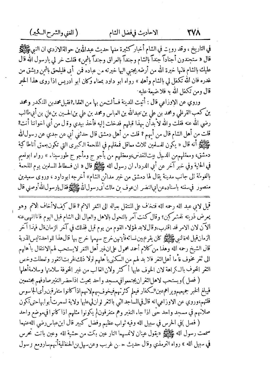 قيل لأبي عبد الله رحمه الله فتخاف على المنتقل بعياله إلى الثغر الإثم؟ قال كيف لا أخاف الأثم وهو يعرض ذريته للمشركين؟ وقال كنت آمر بالتحول بالأهل والعيال إلى الشام قبل اليوم فأنا أنهى عنه الآن لأن الأمر قد اقترب، وقال لابد لهؤلاء القوم من يوم قيل فذلك في آخر الزمان قال فهذا آخر الزمان قيل له فالنبي صلى الله عليه وسلم كان يقرع بين نسائه فأيتهن خرج سهمها خرج بها قال هذا للواحدة ليس الذرية قال الشيخ رحمه الله وهذا من كلام أحمد محمول على أن غير أهل الثغر لا يستحب لهم الانتقال بأهلهم إلى ثغر مخوف فأما أهل الثغر فلابد لهم من السكنى بأهلهم لولا ذلك لخربت الثغور وتعطلت وخص الثغر المخوف بالكراهة لأن الخوف عليها أكثر ولأن الغالب من غير المخوفة سلامتها وسلامة أهلها (فصل) ويستحب لأهل الثغر أن يجتمعوا في مسجد واحد بحيث إذا حضر النفير صادفهم مجتمعين فيبلغ الخبر جميعهم ويراهم عين الكفار فيعلم كثرتهم فيخوف بهم لأنهم إذا كانوا متفرقين رأى الجاسوس قلتهم، وروي عن الأوزاعي أنه قال في المساجد التي بالثغر لو أن لي عليها ولاية لسمرت أبوابها حتى تكون صلاتهم في مسجد واحد حتى إذا جاء النفير وهم متفرقون لم يكونوا مثلهم إذا كانوا في موضع واحد (فصل) في الحرس في سبيل الله وفيه ثواب عظيم وفضل كبير قال ابن عباس رضي الله عنهما سمعت رسول الله صلى الله عليه وسلم (يقول عينان لا تمسهما النار عين بكت من حشية الله وعين باتت تحرس في سبيل الله) رواه الترمذي وقال حديث حسن غريب وعن سهل بن الحنظلية أنهم سارو مع رسول