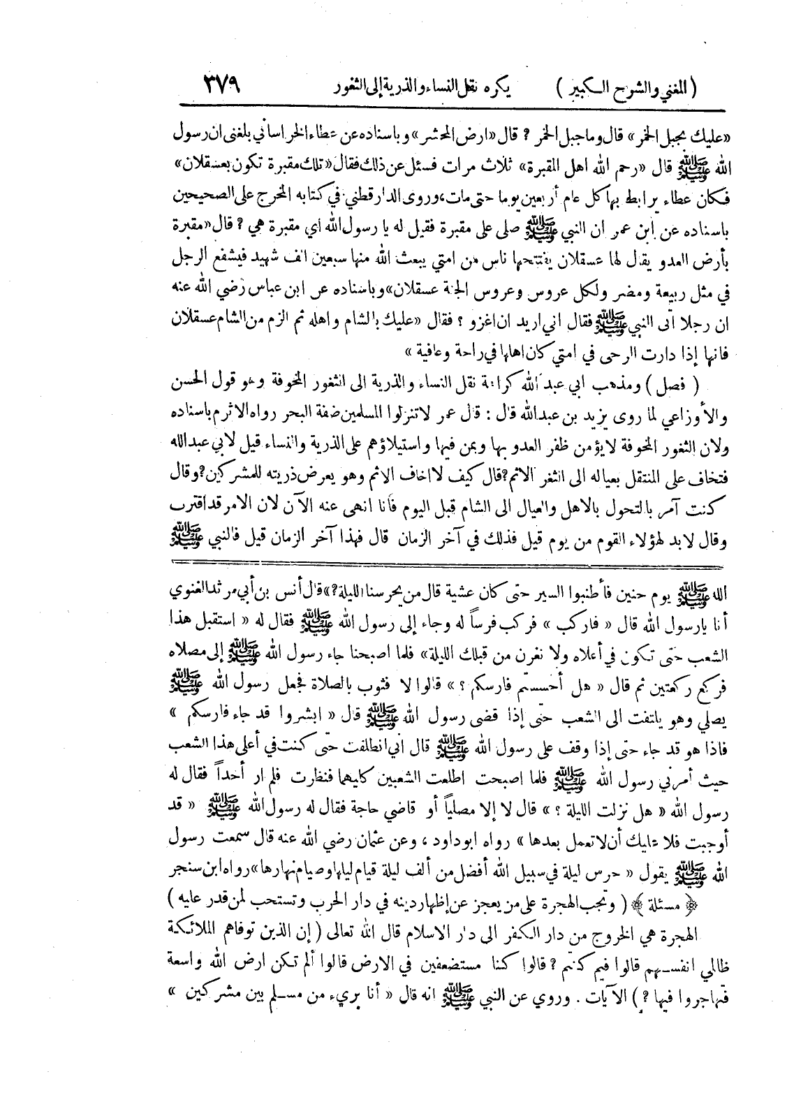 رسول الله (هل نزلت الليلة؟) قال لا إلا مصلياً أو قاضي حاجة فقال له رسول الله صلى الله عليه وسلم (قد أوجبت فلا عليك أن لا تعمل بعدها) رواه أبو داود، وعن عثمان رضي الله عنه قال سمعت رسول الله صلى عليه وسلم يقول (حرس ليلة في سبيل الله أفضل من ألف ليلة قيام ليلها وصيام نهارها) رواه ابن سنجر (مسألة) (وتجب الهجرة على من يعجز عن إظهار دينه في دار الحرب وتستحب لمن قدر عليه) الهجرة هي الخروج من دار الكفر إلى دار الإسلام قال الله تعالى (إن الذين توفاهم الملائكة ظالمي أنفسهم قالوا فيم كنتم؟ قالوا كنا مستضعفين في الأرض قالوا ألم تكن أرض الله واسعة فتهاجروا فيها؟) الآيات.