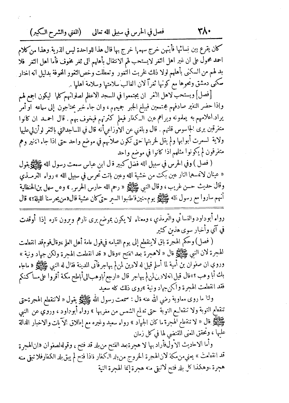 رواه أبو داود والنسائي والترمذي، ومعناه لا يكون بموضع يرى نارهم ويرون ناره إذا أوقدت في آي وأخبار سوى هذين كثير (فصل) وحكم الهجرة باق لا ينقطع إلى يوم القيامة في قول عامة أهل العلم، وقال قوم قد انقطعت الهجرة لأن النبي صلى الله عليه وسلم قال (لاهجرة بعد الفتح) وقال (قد انقطعت الهجرة ولكن جهاد ونية) وروى أن صفوان بن أمية لما أسلم قيل له لا دين لمن لم يهاجر فأتى المدينة فقال له النبي صلى الله عليه وسلم (ما جاء بك أبا وهب؟) قال قيل إنه لا دين لمن لم يهاجر قال (ارجع أبا وهب إلى أباطح مكة أقروا على مساكنكم فقد انقطعت الهجرة ولكن جهاد ونية) روى ذلك كله سعيد ولنا ما روى معاوية رضي الله عنه قال: سمعت رسول الله صلى الله عليه وسلم يقول (لا تنقطع الهجرة حتى تنقطع التوبة ولا تنقطع التوبة حتى تطلع الشمس من مغربها) رواه أبو داود، وروي عن النبي صلى الله عليه وسلم قال (لا تنقطع الهجرة ما كان الجهاد) رواه سعيد وغيره مع إطلاق الآيات والأخبار الدالة عليها، وتحقق المعنى المقتضي لها في كل زمان وأما الاحاديث الأول فأراد بها لا هجرة بعد الفتح من بلد قد فتح، وقوله لصفوان (إن الهجرة قد انقطعت) يعنى من مكة لأن الهجرة الخروج من بلد الكفار فإذا فتح لم يبق بلد الكفار فلا تبقى منه هجرة، وهكذا كل بلد فتح لا تبقى منه هجرة إنما الهجرة النية