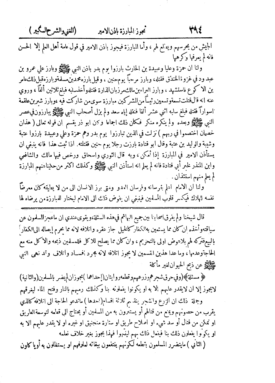 الحاجة وعدمها، وما عدا هذين القسمين لا يجوز إتلافه لأنه مجرد إفساد وإتلاف وقد نهى النبي صلى الله عليه وسلم عن ذبح الحيوان لغير مأكله (مسألة) (وفي حرق شجرهم، وزرعهم وقطعه روايتان (إحداهما) يجوز إن لم يضر بالمسلمين (والثانية) لا يجوز إلا أن لا يقدر عليهم إلا به أو يكونوا يفعلونه بنا وكذلك رميهم بالنار وفتح الماء ليغرقهم وجملة ذلك أن الزرع والشجر ينقسم ثلاثة أقسام (أحدها) ما تدعو الحاجة إلى إتلافه كالذي يقرب من حصونهم ويمنع من قتالهم أو يستترون به من المسلمين أو يحتاج إلى قطعه لتوسعة الطريق أو تمكن من قتال أو سد شئ أو اصلاح طريق أو ستارة منجنيق أو غيره أو لا يقدر عليهم إلا به أو يكونوا يفعلون ذلك بنا فيفعل ذلك بهم لينتهوا فهذا يجوز بغير خلاف نعلمه (الثاني) ما يتضرر المسلمون بقطعه لكونهم ينتفعون ببقائه لعلوفهم أو يستظلون به أو يأكلون