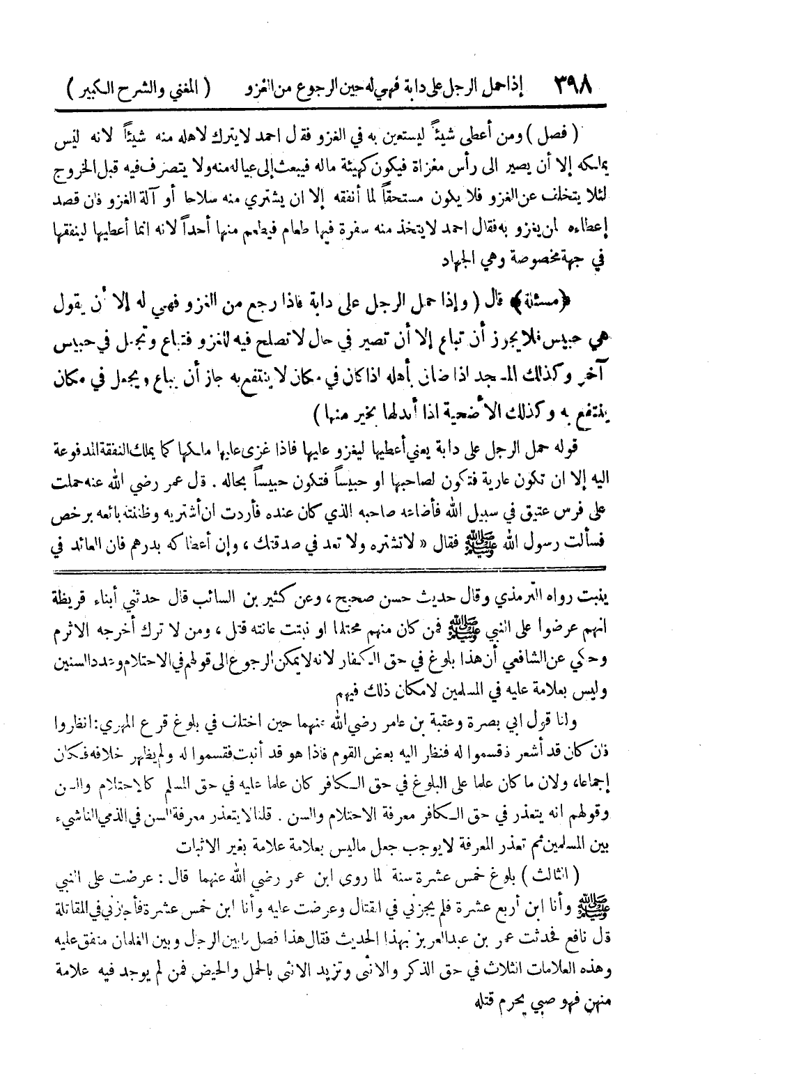 ينبت رواه الترمذي وقال حديث حسن صحيح، وعن كثير بن السائب قال حدثني أبناء قريظة أنهم عرضوا على النبي صلى الله عليه وسلم فمن كان منهم محتلماً أو نبتت عانته قتل، ومن لا ترك اخرجه الأثرم وحكي عن الشافعي أن هذا بلوغ في حق الكفار لأنه لا يمكن الرجوع إلى قولهم في الإحتلام وعدد السنين وليس بعلامة عليه في المسلمين لإمكان ذلك فيهم ولنا قول أبي بصرة وعقبة بن عامر رضي الله عنهما حين اختلف في بلوغ قرع المهري: انظروا فإن كان قد أشعر فاقسموا له فنظر إليه بعض القوم فإذا هو قد أنبت فقسموا له ولم يظهر خلافه فكان أجماعاً، ولأن ما كان علما على البلوغ في حق الكفار كان علما عليه في حق المسلم كالاحتلام والسن وقولهم أنه يتعذر في حق الكافر معرفة الاحتلام والسن.