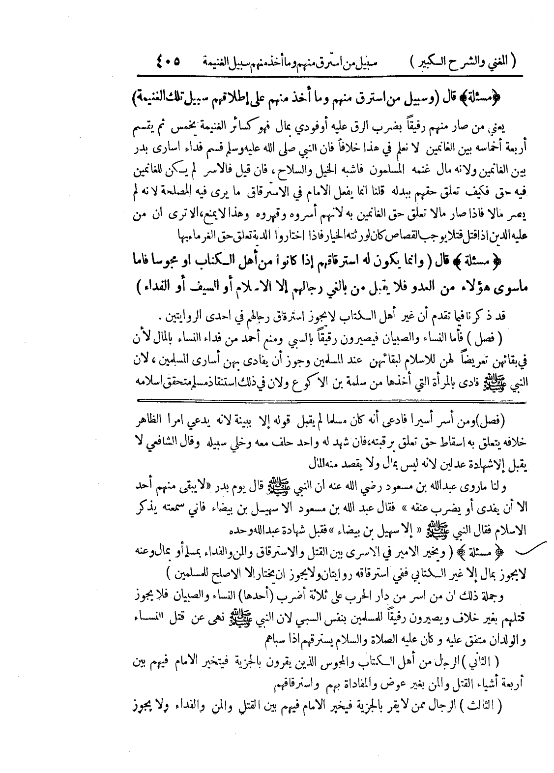 (فصل) ومن أسر أسيراً فادعى أنه كان مسلماً لم يقبل قوله إلا ببينة لأنه يدعي أمراً الظاهر خلافه يتعلق به اسقاط حق تعلق برقبته، فإن شهد له واحد حلف معه وخلي سبيله وقال الشافعي لا يقبل إلا شهادة عدلين لأنه ليس بمال ولا يقصد منه المال ولنا ما روى عبد الله بن مسعود رضي الله عنه أن النبي صلى الله عليه وسلم قال يوم بدر (لا يبقى منهم أحد إلا أن يفدي أو يضرب عنقه) فقال عبد الله بن مسعود إلا سهيل بن بيضاء فإني سمعته يذكر الإسلام فقال النبي صلى الله عليه وسلم (إلا سهيل بن بيضاء) فقبل شهادة عبد الله وحده (مسألة) (ويخير الأمير في الأسرى بين القتل والاسترقاق والمن والفداء بمسلم أو بمال وعنه لا يجوز بمال إلا غير الكتابي ففي استرقاقه روايتان ولايجوز أن يختار إلا الأصلح للمسلمين) وجملة ذلك أن من أسر من دار الحرب على ثلاثة أضرب (أحدها) النساء والصبيان فلا يجوز قتلهم بغير خلاف ويصيرون رقيقاً للمسلمين بنفس السبي لأن النبي صلى الله عليه وسلم نهى عن قتل النساء والولدان متفق عليه وكان عليه الصلاة والسلام يسترقهم إذا سباهم (الثاني) الرجال من أهل الكتاب والمجوس الذين يقرون بالجزية فيتخير الإمام فيهم بين أربعة أشياء القتل والمن بغير عوض والمفاداة بهم واسترقاقهم (الثالث) الرجال ممن لايقر بالجزية فيخير الإمام فيهم بين القتل والمن والفداء ولايجوز
