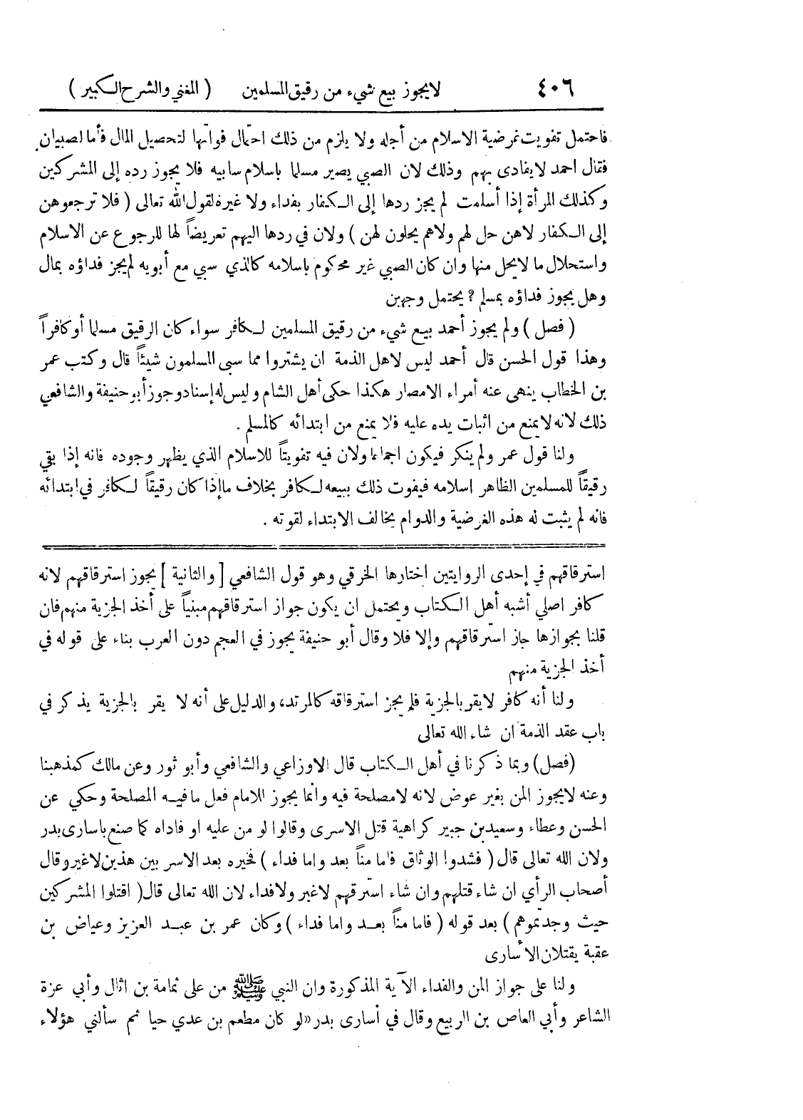 أخذ الجزية منهم ولنا أنه كافر لا يقر بالجزية فلم يجز استرقاقه كالمرتد، والدليل على أنه لا يقر بالجزية يذكر في باب عقد الذمة إن شاء الله تعالى (فصل) وبما ذكرنا في أهل الكتاب قال الاوزاعي والشافعي وأبو ثور وعن مالك كمذهبنا وعنه لا يجوز المن بغير عوض لأنه لا مصلحة فيه وإنما يجوز للإمام فعل ما فيه المصلحة وحكي عن الحسن وعطاء وسعيد بن جبير كراهية قتل الأسرى وقالوا لو من عليه أو فاداه كما صنع بأسارى بدر ولأن الله تعالى قال (فشدوا الوثاق فإما منا بعد وإما فداء) فخيره بعد الاسربين هذين لا غير وقال أصحاب الرأي إن شاء قتلهم وإن شاء استرقهم لاغير ولافداء لأن الله تعالى قال (اقتلوا المشركين حيث وجدتموهم) بعد قوله (فإما منا بعد وإما فداء) وكان عمر بن عبد العزيز وعياض بن عقبة يقتلان الأسارى ولنا على جواز المن والفداء الآية المذكورة وأن النبي صلى الله عليه وسلم من على ثمامة بن أثال وأبي عزة الشاعر وأبي العاص بن الربيع وقال في أسارى بدر (لو كان مطعم بن عدي حياً ثم سألني هؤلاء