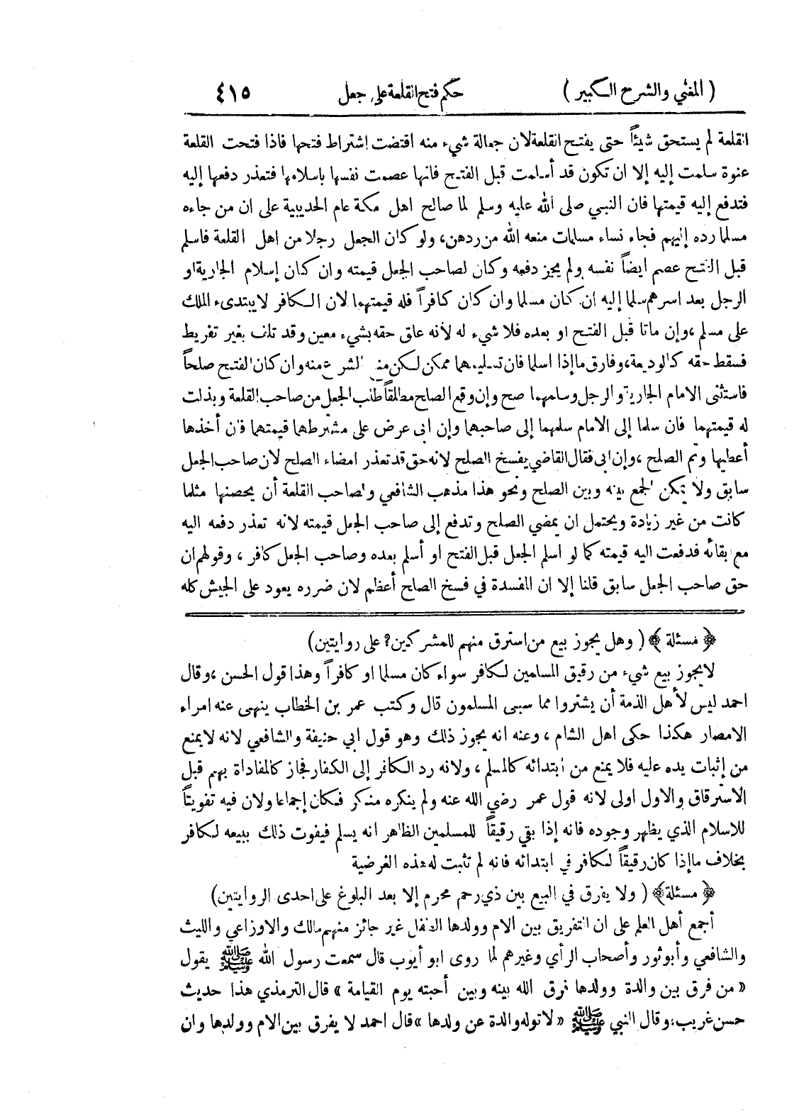 أحمد ليس لأهل الذمة أن يشتروا مما سبى المسلمون قال وكتب عمر بن الخطاب ينهى عنه أمراء الأمصار هكذا حكى أهل الشام، وعنه أنه يجوز ذلك وهو قول أبي حنيفة والشافعي لأنه لا يمنع من إثبات يده عليه فلا يمنع من ابتدائه كالمسلم، ولأنه رد الكافر إلى الكفار فجاز كالمفاداة بهم قبل الاسترقاق والأول أولى لأنه قول عمر رضي الله عنه ولم ينكره منكر فكان إجماعاً ولأن فيه تفويتاً للاسلام الذي يظهر وجوده فإنه إذا بقي رقيقاً للمسلمين الظاهر أنه يسلم فيفوت ذلك ببيعه لكافر بخلاف ما إذا كان رقيقاً لكافر في ابتدائه فإنه لم تثبت له هذه الغرضية (مسألة) (ولا فرق في البيع بين ذي رحم محرم إلا بعد البلوغ على إحدى الروايتين) أجمع أهل العلم على أن التفريق بين الأم وولدها الطفل غير جائز منهم مالك والاوزاعي والليث والشافعي وأبو ثور وأصحاب الرأي وغيرهم لما روى أبو أيوب قال سمعت رسول الله صلى الله عليه وسلم يقول (من فرق بين والدة وولدها فرق الله بينه وبين أحبته يوم القيامة) قال الترمذي هذا حديث حسن غريب، وقال النبي صلى الله عليه وسلم (لا توله والدة عن ولدها) قال أحمد لا يفرق بين الأم وولدها وإن