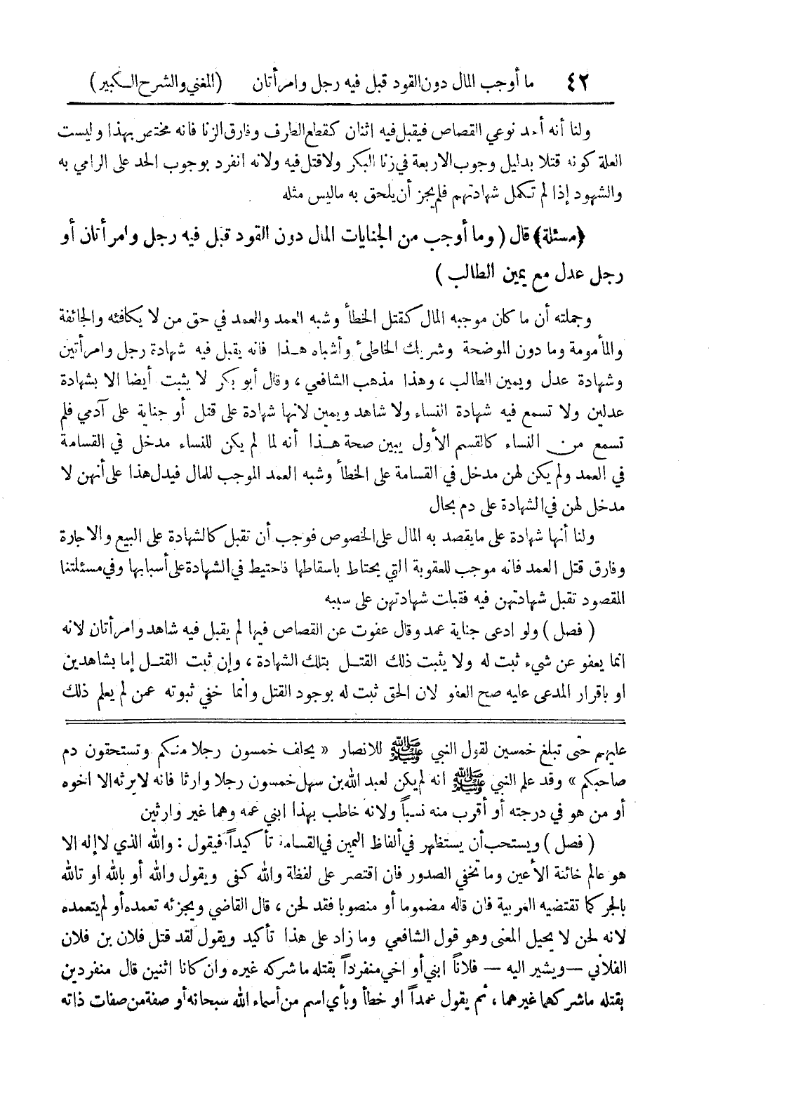 عليهم حتى تبلغ خمسين لقول النبي صلى الله عليه وسلم للانصار (يحلف خمسون رجلا منكم وتستحقون دم صاحبكم) وقد علم النبي صلى الله عليه وسلم أنه لم يكن لعبد الله بن سهل خمسون رجلاً وارثاً فانه لا يرثه إلا اخوة أو من هو في درجته) أو أقرب منه نسباً ولأنه خاطب بهذا ابني عمه وهما غير وارثين (فصل) ويستحب أن يستظهر في ألفاظ اليمين في القسامة تأكيداً فيقول: والله الذي لا إله إلا هو عالم خائنة الأعين وما تخفي الصدور فان اقتصر على لفظة والله كفى ويقول والله أو بالله أو تالله بالجر كما تقتضيه العربية فان قاله مضموما أو منصوبا فقد لحن، قال القاضي ويجزئه تعمده أو لم يتعمده لانه لحن لا يحيل المعنى وهو قول الشافعي وما زاد على هذا تأكيد ويقول لقد قتل فلان بن فلان الفلاني ويشير اليه فلاناً ابني أو أخي منفرداً بقتله ما شركه غيره وان كنا اثنين قال منفردين بقتله ما شركهما غيرهما، ثم يقول عمداً أو خطأ وبأي اسم من أسماء الله سبحانه أو صفة من صفات ذاته