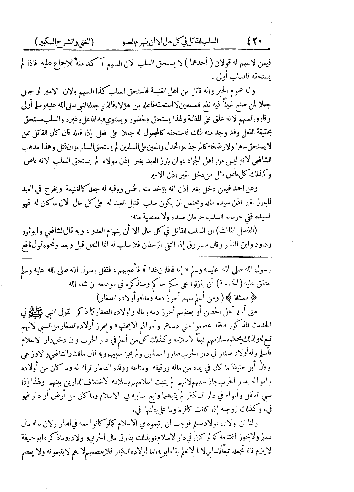 رسول الله صلى الله عليه وسلم (إنا قافلون غداً) فأعجبهم، فقفل رسول الله صلى الله عليه وسلم متفق عليه (الخامسة) أن ينزلوا على حكم حاكم وسنذكره في موضعه إن شاء الله (مسألة) (ومن أسلم منهم أحرز دمه وماله وأولاده الصغار) متى أسلم أهل الحصن أو بعضهم أحرز دمه وماله وأولاده الصغار كما ذكر لقول النبي صلى الله عليه وسلم في الحديث المذكور (فقد عصموا مني دماءهم وأموالهم الا بحقها) ويحرز أولاده الصغار من السبي لأنهم تبع له ولذلك يحكم بإسلامهم تبعاً لاسلامه وكذلك كل من أسلم في دار الحرب وإن دخل دار الإسلام فأسلم وله أولاد صغار في دار الحرب صاروا مسلمين ولم يجز سبيهم وبه قال مالك والشافعي والاوزاعي وقال أبو حنيفة ما كان في يده من ماله ورقيقه ومتاعه وولده الصغار ترك له وما كان من أولاده وأمواله بدار الحرب جاز سبيهم لأنهم لم يثبت إسلامهم بإسلامه لاختلاف الدارين بينهم ولهذا إذا سبي الطفل وأبواه في دار الكفر لم يتبعهما وتبع سابيه في الإسلام وما كان من أرض أو دار فهو فئ وكذلك زوجته إذا كانت كافرة وما على بطنها فئ ولنا ان اولاده أولاد مسلم فوجب أن يتبعوه في الإسلام كما لو كانوا معه في الدار ولأن ماله مال مسلم ولايجوز اغتنامه كما لو كان في دار الإسلام، وبذلك يفارق مال الحربي وأولاده وما ذكره أبو حنيفة لا يلزم فانا تجعله تبعاً للسابي لأنا لا نعلم بقاء أبويه فأما أولاده الكبار فلا يعصمهم لأنهم لا يتبعونه ولا يعصم