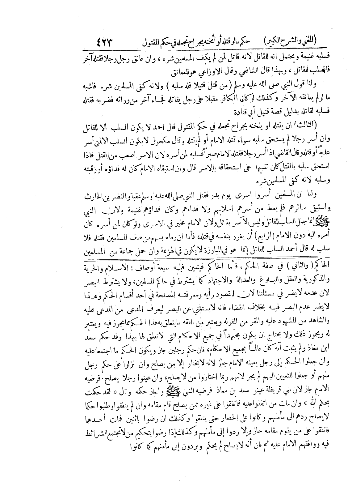 الحاكم (والثاني) في صفة الحكم، فأما الحاكم فيتعين فيه سبعة أوصاف: الاسلام والحرية والذكورية والعقل والبلوغ والعدالة والاجتهاد كما يشترط في حاكم المسلمين، ولا يشترط البصر لأن عدمه لا يضر في مسئلتنا لان لمقصود (المقصود) رأيه ومعرفته المصلحة في أحد أقسام الحكم وهذا لا يضر عدم البصر فيه بخلاف القضاء فإنه لا يستغني عن البصر ليعرف المدعي من المدعي عليه والشاهد من المشهود عليه والمقر من المقر له ويعتبر من الفقه ما يتعلق به هذا الحكم مما يجوز فيه ويعتبر له ويجوز ذلك ولا يحتاج أن يكون مجتهداً في جميع الاحكام التي لا تعلق لها بهذا وقد حكم سعد ابن معاذ ولم يثبت أنه كان عالماً بجميع الأحكام، فإن حكم رجلين جاز ويكون الحكم ما اجتمعا عليه وإن جعلوا الحكم إلى رجل يعينه الإمام جاز لأنه لا يختار إلا من يصلح وإن نزلوا على حكم رجل منهم أو جعلوا التعيين إليهم لم يجز لأنهم ربما اختاروا من لا يصلح، وإن عينوا رجلا يصلح.