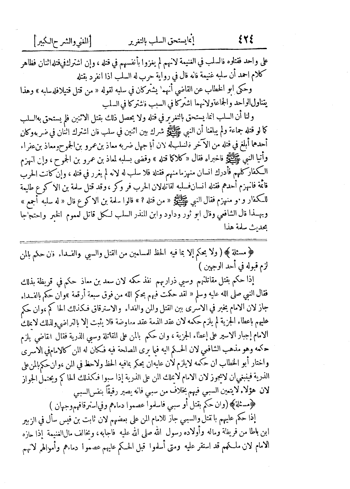 إذا حكم بقتل مقاتلهم وسبي ذراريهم نفذ حكمه لأن سعد بن معاذ حكم في قريظة بذلك فقال النبي صلى الله عليه وسلم (لقد حكمت فيهم بحكم الله من فوق سبعة أرقعة) وإن حكم بالفداء جاز لأن الإمام يخير في الأسرى بين القتل والمن والفداء والاسترقاق فكذلك الحاكم، وإن حكم عليهم باعطاء الجزية لم يلزم حكمه لأن عقد الذمة عقد معاوضة فلا يثبت إلا بالتراضي ولذلك لا يملك الإمام إجبار الأسير على إعطاء الجزية، وإن حكم بالمن على المقاتلة وسبي الذرية فقال القاضي يلزم حكمه وهو مذهب الشافعي لأن الحكم إليه فيما يرى المصلحة فيه فكان له المن كالامام في الاسرى واختار أبو الخطاب أن حكمه لا يلزم لأن عليه أن يحكم بما فيه الحظ ولا حظ في المن، وإن حكم بالمن على الذرية فينبغي أن لا يجوز لأن الامام لا يملك المن على الذرية إذا سبوا فكذلك الحاكم ويحتمل الجواز لأن هؤلاء لا يتعين السبي فيهم بخلاف من سبي فإنه يصير رقيقاً بنفس السبي (مسألة) (وإن حكم بقتل أو سبي فأسلموا عصموا دماءهم وفي استرقاقهم وجهان) إذا حكم عليهم بالقتل والسبي جاز للإمام المن على بعضهم لأن ثابت بن قيس سأل في الزبير ابن باطا من قريظة وماله وأولاده رسول الله صلى الله عليه فأجابه، ويخالف مال الغنيمة إذا حازه الإمام لأن ملكهم قد استقر عليه ومتى أسلموا قبل الحكم عليهم عصموا دماءهم وأموالهم لانهم