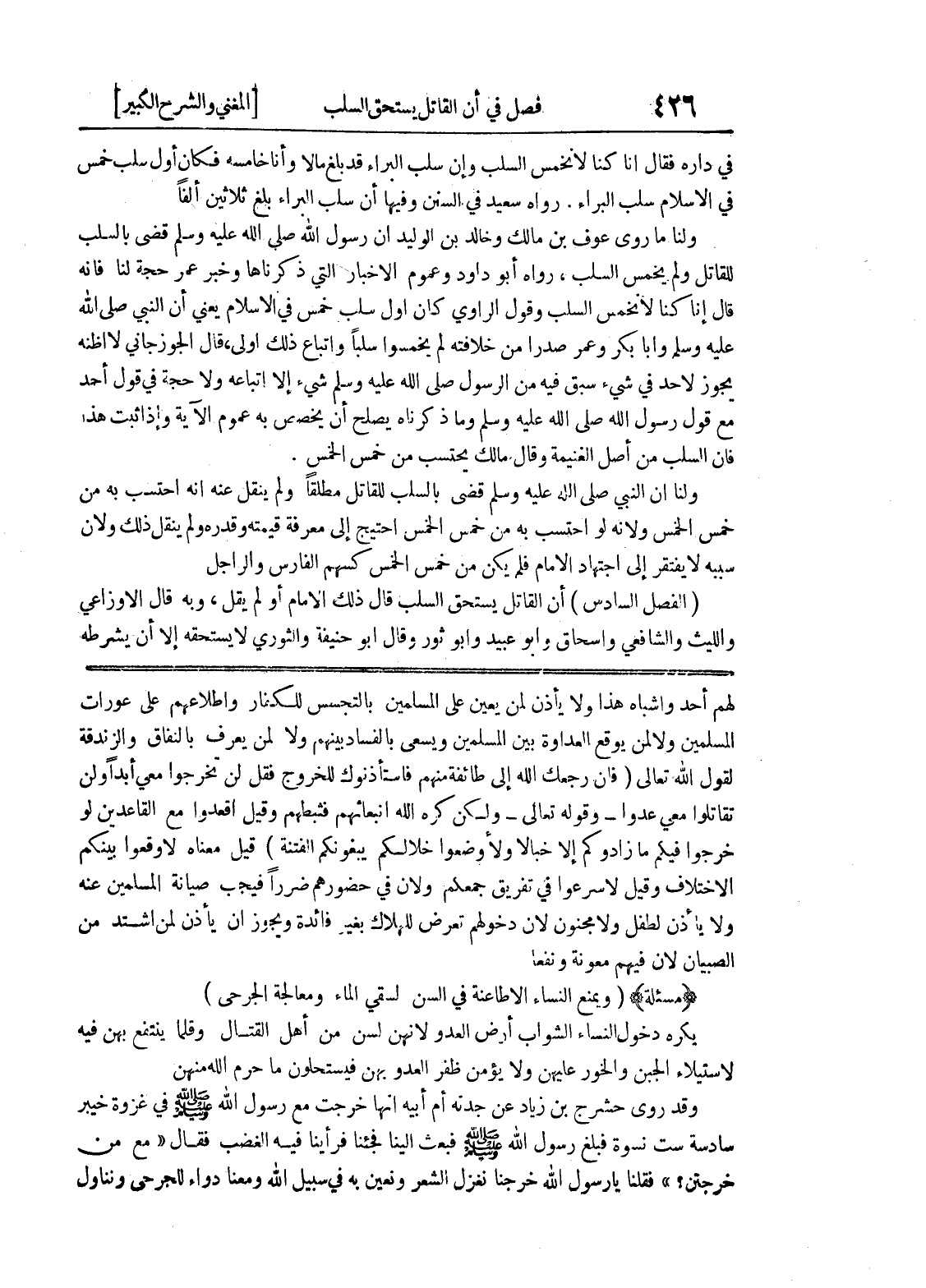 لهم أحد وأشباه هذا ولا يأذن لمن يعين على المسلمين بالتجسس للكفار واطلاعهم على عورات المسلمين ولا لمن يوقع العداوة بين المسلمين ويسعى بالفساد بينهم ولا لمن يعرف بالنفاق والزندقة لقول الله تعالى (فإن رجعك الله إلى طائفة منهم فاستأذنوك للخروج فقل لن تخرجوا معي أبدا ولن تقاتلوا معي عدوا - وقوله تعالى - ولكن كره الله انبعاثهم فثبطهم وقيل اقعدوا مع القاعدين لو خرجوا فيكم ما زادوكم إلا خبالا ولأوضعوا خلالكم يبغونكم الفتنة) قيل معناه لأوقعوا بينكم الاختلاف وقيل لأسرعوا في تفريق جمعكم ولأن في حضورهم ضرراً فيجب صيانة المسلمين عنه ولا يأذن لطفل ولا مجنون لأن دخولهم تعرض للهلاك بغير فائدة ويجوز أن يأذن لمن اشتد من الصبيان لأن فيهم معونة ونفعا (مسألة) (ويمنع النساء إلا طاعنة في السن لسقي الماء ومعالجة الجرحى) يكره دخول النساء الشواب أرض العدو لأنهن لسن من أهل القتال وقلما ينتفع بهن فيه لاستيلاء الجبن والخور عليهن ولا يؤمن ظفر العدو بهن فيستحلون ما حرم الله منهن وقد روى حشرج بن زياد عن جدته أم أبيه أنها خرجت مع رسول الله صلى الله عليه وسلم في غزوة خيبر سادسة ست نسوة فبلغ رسول الله صلى الله عليه وسلم فبعث إلينا فجئنا فرأينا فيه الغضب فقال) (مع من خرجتن؟) فقلنا يارسول الله خرجنا نغزل الشعر ونعين به في سبيل الله ومعنا دواء للجرحى ونناول
