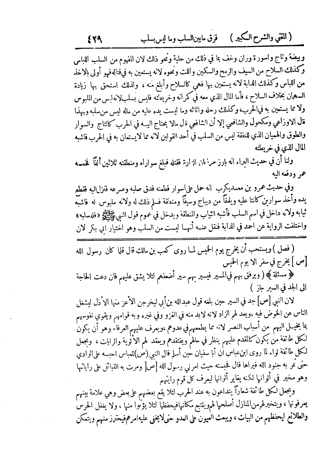 (فصل) ويستحب أن يخرج يوم الخميس لما روى كعب بن مالك قال قلما كان رسول الله [ص] يخرج في سفر إلا يوم الخميس (مسألة) (ويرفق بهم في المسير فيسير بهم سير أضعفهم لئلا يشق عليهم فان دعت الحاجة إلى الجد في السير جاز) لأن النبي [ص] جد في السير حين بلغه قول عبد الله بن أبي ليخرجن الأعز منها الأذل ليشغل الناس عن الخوض فيه، ويعدلهم الزاد لانه لابد منه في الغزو وفي غيره وبه قوامهم ويقوي نفوسهم بما يخيل إليهم من أسباب النصر لأنه مما يطمعهم في عدوهم، ويعرف عليهم العرفاء وهو أن يكون لكل طائفة من يكون كالمقدم عليهم ينظر في حالهم ويفتقدهم ويعقد لهم الألوية والرايات، ويجعل لكل طائفة لواء لما روى ابن عباس أن أبا سفيان حين أسلم قال النبي (ص) للعباس إحبسه على الوادي حتى تمر به جنود الله فيراها قال فحبسته حيث أمرني رسول الله [ص [ومرت به القبائل على راياتها وهو مخير في ألوانها لكنه يغاير ألوانها ليعرف كل قوم رايتهم ويجعل لكل طائفة شعاراً يتداعون به عند الحرب لئلا يقع بعضهم على بعض وهي علامة بينهم يعرفونها، ويتخير لهم من المنازل أصلحها لهم ويتتبع مكانها فيحفظها لئلا يؤتوا منها، ولا يغفل الحرس والطلائع ليحفظهم من البيات، ويبعث العيون على العدو حتى لا يخفي عليه أمرهم فيحترز منهم ويتمكن