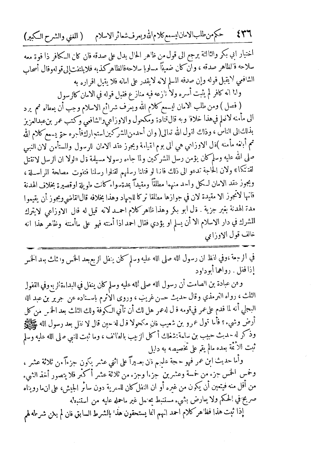 وعن عبادة بن الصامت أن رسول الله صلى الله عليه وسلم كان ينفل في البداءة الربع وفي القفول الثلث، رواه الترمذي وقال حديث حسن غريب، وروى الأثرم باسناده عن جرير بن عبد الله البجلي أنه لما قدم على عمر في قومه قال له عمر هل لك أن تأتي الكوفة ولك الثلث بعد الخمس من كل أرض وشئ؟ فأما قول عمرو بن شعيب فإن مكحولا قال له حين قال لا نفل بعد رسول الله صلى الله عليه وسلم وذكر له حديث حبيب بن سلمة: شغلك أكل الزبيب بالطائف، وما ثبت للنبي صلى الله عليه وسلم ثبت للأئمة بعده ما لم يقم على تخصيصه به دليل وأما حديث ابن عمر فهو حجة عليهم فإن بعيراً على اثني عشر يكون جزءاً من ثلاثة عشر، وخمس الخمس جزء من خمسة وعشرين جزءاً وجزء من ثلاثة عشر أكثر فلا يتصور أخذ الشئ من أقل منه فيتعين أن يكون من غيره أو أن النفل كان للسرية دون سائر الجيش، على أن ما رويناه صريح في الحكم ولا يعارض بشئ مستنبط يحتمل غير ما حمله عليه من استنبطه إذا ثبت هذا فظاهر كلام أحمد أنهم إنما يستحقون هذا بالشرط السابق فإن لم يكن شرطه لهم