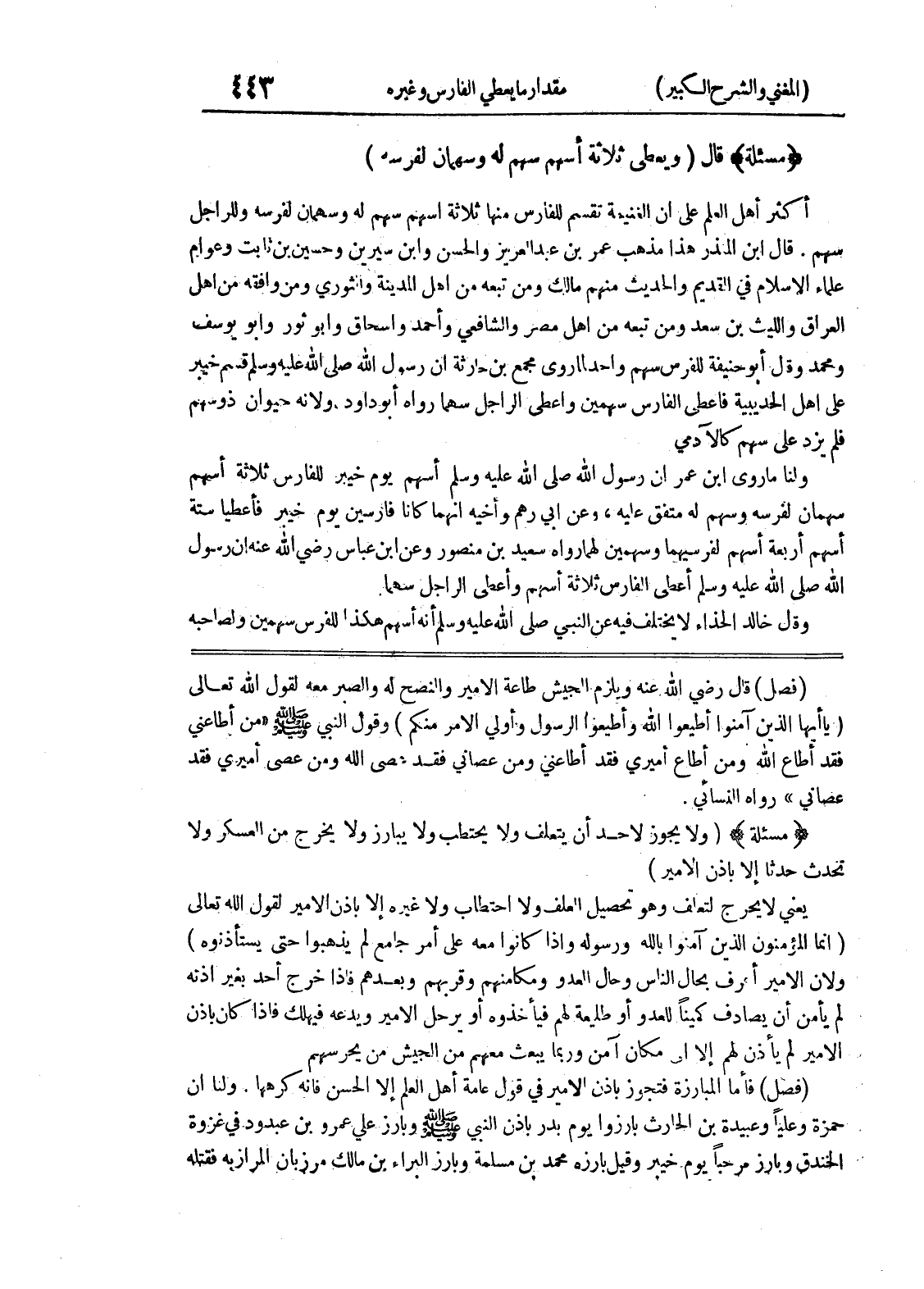 (مسألة) (ولا يجوز لأحد أن يتعلف ولا يحتطب ولا يبارز ولا يخرج من العسكر ولا تحدث حدثا إلا بإذن الأمير) يعني لا يحرج لتعلف وهو تحصيل العلف ولا احتطاب ولا غيره إلا بإذن الأمير لقول الله تعالى (إنما المؤمنون الذين آمنوا بالله ورسوله وإذا كانوا معه على أمر جامع لم يذهبوا حتى يستأذنوه) ولأن الأمير أعرف بحال الناس وحال العدو ومكامنهم وقربهم وبعدهم فإذا خرج أحد بغير إذنه