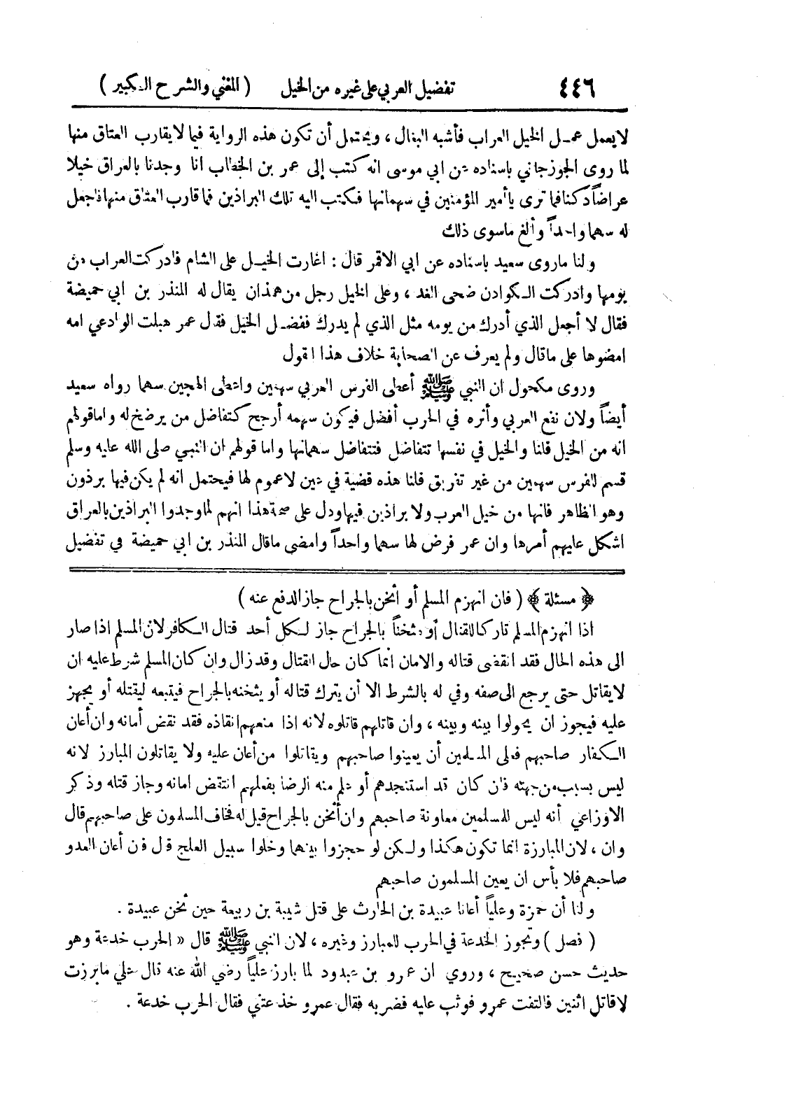 (فصل) وتجوز الخدعة في الحرب للمبارز وغيره، لأن النبي صلى الله عليه وسلم قال (الحرب خدعة وهو حديث حسن صحيح، وروي أن عمرو بن عبدود لما بارز علياً رضي الله عنه قال علي ما برزت لا قاتل اثنين فالتفت عمرو فوثب عليه فضربه فقال عمرو خدعتني فقال الحرب خدعة.