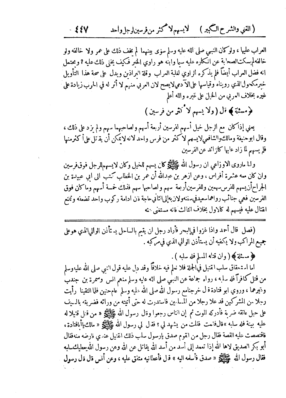 أما استحقاق سلب القتيل في الجملة فلا نعلم فيه خلافاً وقد دل عليه قول النبي صلى الله عليه وسلم من قتل كافراً فله سلبه، رواه جماعة عن النبي صلى الله عليه وسلم منهم أنس وسمرة بن جندب وغيرهما، وروي أبو قتادة قال خرجنا مع رسول الله صلى الله عليه وسلم عام حنين فلما التقينا رأيت رجلا من المشركين قد علا رجلاً من المسلمين فاستدرت له حتى أتيته من ورائه فضربته بالسيف على حبل عاتقه ضربة فأدركه الموت ثم إن الناس رجعوا وقال رسول الله صلى الله عليه وسلم (من قتل قتيلاً له عليه بينه فله سلبه) قال فقمت فقلت من يشهد لي؟ فقال لي رسول الله صلى الله عليه وسلم (مالك يا أبا قتادة، فاقتصصت عليه القصة فقال رجل من القوم صدق يا رسول سلب ذلك القتيل عندي فارضه منه فقال أبو بكر الصديق لاها الله إذا تعمد إلى أسد من أسد الله يقاتل عن الله وعن رسول الله يعطيك سلبه فقال رسول الله صلى الله عليه وسلم (صدق فأسلمه إليه) قال فأعطانيه متفق عليه، وعن أنس قال قال رسول