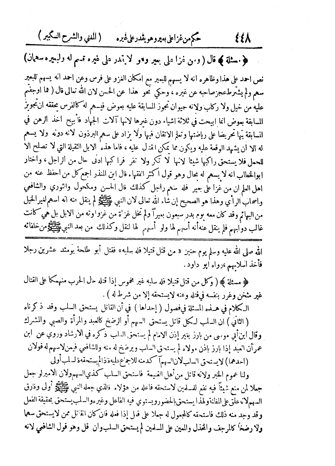 الكلام في هذه المسألة في فصول (إحداها) في أن القاتل يستحق السلب وقد ذكرناه (الثاني) أن السلب لكل قاتل يستحق السهم أو الرضخ كالعبد والمرأة والصبي والمشرك وقال ابن أبي موسى من بارز بغير إذن الإمام لم يستحق السلب ذكره في الإرشاد وروي عن ابن عمر أن العبد إذا بارز بإذن مولاه لم يستحق السلب ويرضخ له منه وللشافعي فيمن لا سهم له قولان (أحدهما) لا يستحق السلب لأن السهم آكد منه للإجماع عليه فإذا لم يستحقه فالسلب أولى ولنا عموم الخبر ولأنه قاتل من أهل الغنيمة فاستحق السلب كذي السهم ولأن الأمير لو جعل جعلا لمن منع شيئاً فيه نفع للمسلمين لاستحقه فاعله من هؤلاء فالذي جعله النبي صلى الله عليه وسلم أولى وفارق السهم لأنه علق على المظنة ولهذا يستحق بالحضور ويستوي فيه الفاعل وغيره والسلب يستحق بحقيقة الفعل وقد وجد منه ذلك فاستحقه كالمجعول له جعلا على فعل إذا فعله فإن كان القاتل ممن لا يستحق سهما ولا رضخاً كالمرجف والمخذل والمعين على المسلمين لم يستحق السلب وإن قل وهو قول الشافعي لأنه