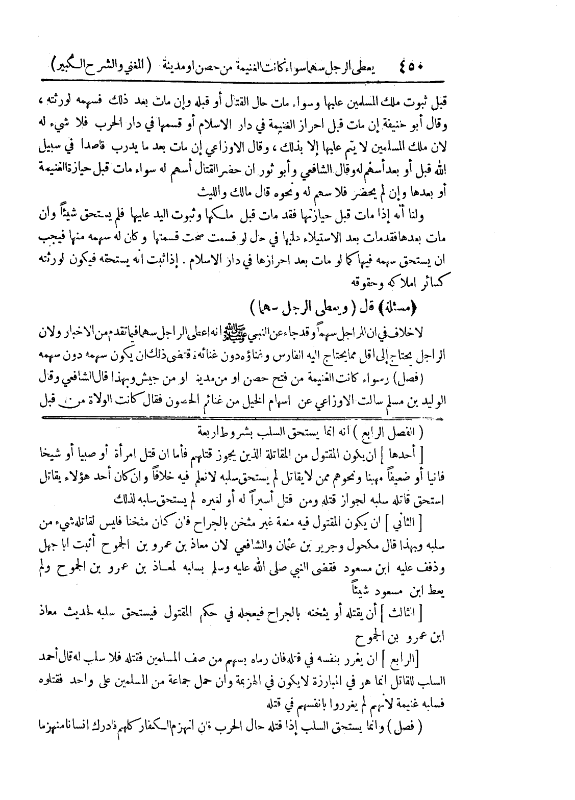 (الفصل الرابع) أنه إنما يستحق السلب بشروط أربعة [أحدها] أن يكون المقتول من المقاتلة الذين يجوز قتلهم فأما إن قتل امرأة أو صبياً أو شيخا فاينا أو ضعيفاً مهيناً ونحوهم ممن لا يقاتل لم يستحق سلبه لا نعلم فيه خلافاً وإن كان أحد هؤلاء يقاتل استحق قاتله سلبه لجواز قتله ومن قتل أسيراً له أو لغيره لم يستحق سلبه لذلك [الثاني] أن يكون المقتول فيه منعه غير مثخن بالجراح فإن كان مثخناً فليس لقاتله شئ من سلبه وبهذا قال مكحول وجرير بن عثمان والشافعي لأن معاذ بن عمرو بن الجموح أثبت أبا جهل وذفف عليه ابن مسعود فقضى النبي صلى الله عليه وسلم بسلبه لمعاذ بن عمرو بن الجموح ولم يعط ابن مسعود شيئاً [الثالث] أن يقتله أو يثخنه بالجراح فيعجله في حكم المقتول فيستحق سلبه لحديث معاذ ابن عمرو بن الجموح [الرابع] أن يغرر بنفسه في قتله فإن رماه بسهم من صف المسلمين فقتله فلا سلب له قال أحمد السلب للقاتل إنما هو في المبارزة لا يكون في الهزيمة وإن حمل جماعة من المسلمين على واحد فقتلوه فسلبه غنيمة لأنهم لم يغرروا بأنفسهم في قتله (فصل) وإنما يستحق السلب إذا قتله حال الحرب فإن انهزم الكفار كلهم فأدرك انسانا منهزما
