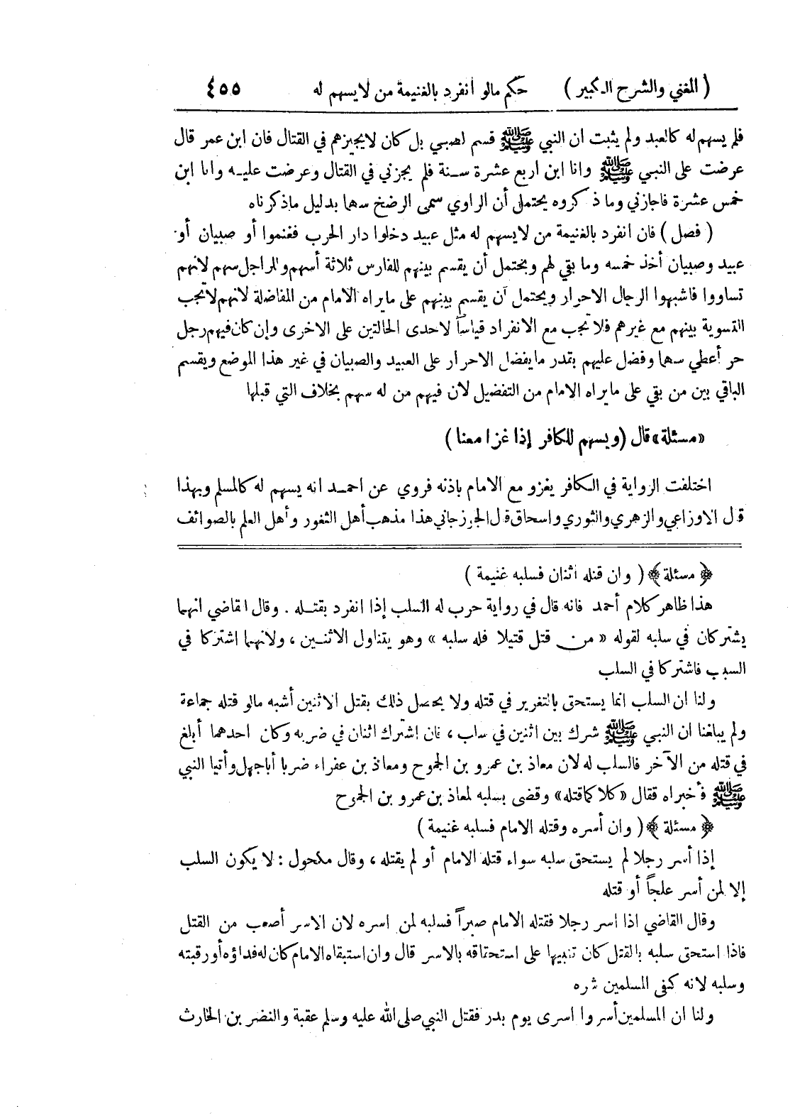 صلى الله عليه وسلم فأخبراه فقال (كلاكما قتله) وقضى بسلبه لمعاذ بن عمرو بن الجموح (مسألة) (وإن أسره وقتله الإمام فسلبه غنيمة) إذا أسر رجلا لم يستحق سلبه سواء قتله الإمام أو لم يقتله، وقال مكحول: لا يكون السلب إلا لمن أسر علجاً أو قتله وقال القاضي إذا أسر رجلا فقتله الإمام صبراً فسلبه لمن اسره لان الأسر أصعب من القتل فإذا استحق سلبه بالقتل كان تنبيها على استحقاقه بالأسر قال وان استبقاه الإمام كان له فداؤه أو رقبته وسلبه لأنه كفى المسلمين شره ولنا أن المسلمين أسروا أسرى يوم بدر فقتل النبي صلى الله عليه وسلم عقبة والنضر بن الحارث