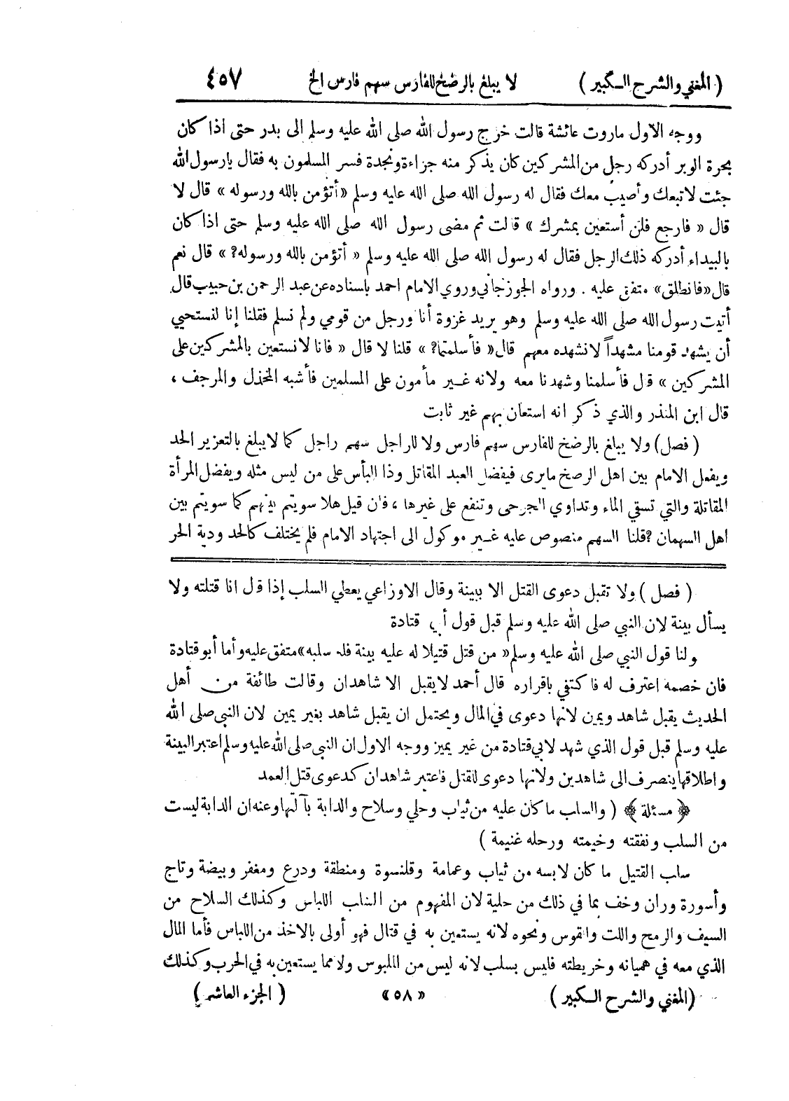 (فصل) ولا تقبل دعوى القتل إلا ببينة وقال الأوزاعي يعطي السلب إذا قال أنا قتلته ولا يسأل بينه لأن النبي صلى الله عليه وسلم قبل قول أبي قتادة ولنا قول النبي صلى الله عليه وسلم (من قتل قتيلاً له عليه بينه فله سلبه) متفق عليه وأما أبو قتادة فإن خصمه اعترف له فاكتفى بإقراره قال أحمد لا يقبل إلا شاهدان وقالت طائفة من أهل الحديث يقبل شاهد ويمين لأنها دعوى في المال ويحتمل أن يقبل شاهد بغير يمين لأن النبي صلى الله عليه وسلم قبل قول الذي شهد لابي قتادة من غير يميز ووجه الأول أن النبي صلى الله عليه وسلم اعتبر البينة واطلاقها ينصرف إلى شاهدين ولأنها دعوى للقتل فاعتبر شاهدان كدعوى قتل العمد (مسألة) (والسلب ما كان عليه من ثياب وحلي وسلاح والدابة بآلتها وعنه أن الدابة ليست من السلب ونفقته وخيمته ورحله غنيمة) سلب القتيل ما كان لابسه من ثياب وعمامة وقلنسوة ومنطقة ودرع ومغفر وبيضة وتاج وأسورة وران وخف بما في ذلك من حلية لأن المفهوم من السلب اللباس وكذلك السلاح من السيف والرمح واللت والقوس ونحوه لأنه يستعين به في قتال فهو أولى بالأخذ من اللباس فأما المال الذي معه في هميانه وخريطته فليس بسلب لأنه ليس من الملبوس ولا مما يستعين به في الحرب وكذلك
