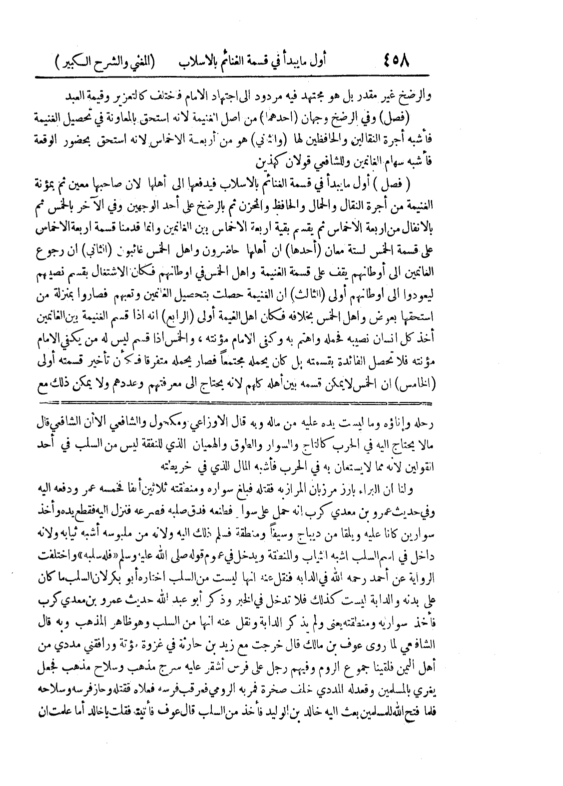 الرواية عن أحمد رحمه الله في الدابة فنقل عنه أنها ليست من السلب اختاره أبو بكر لأن السلب ما كان على بدنه والدابة ليست كذلك فلا تدخل في الخبر وذكر أبو عبد الله حديث عمرو بن معدي كرب فأخذ سواريه ومنطقته يعني ولم يذكر الدابة ونقل عنه أنها من السلب وهو ظاهر المذهب وبه قال الشافعي لما روى عوف بن مالك قال خرجت مع زيد بن حارثة في غزوة مؤتة ورافقني مددي من أهل اليمن فلقينا جموع الروم وفيهم رجل على فرس أشقر عليه سرج مذهب وسلاح مذهب فجعل يغري بالمسلمين وقعد له المددي خلف صخرة فمر به الرومي فعرقب فرسه فعلاه ققتله وحاز فرسه وسلاحه فلما فتح الله للمسلمين بعث إليه خالد بن الوليد فأخذ من السلب قال عوف فأتيته فقلت يا خالد أما علمت أن
