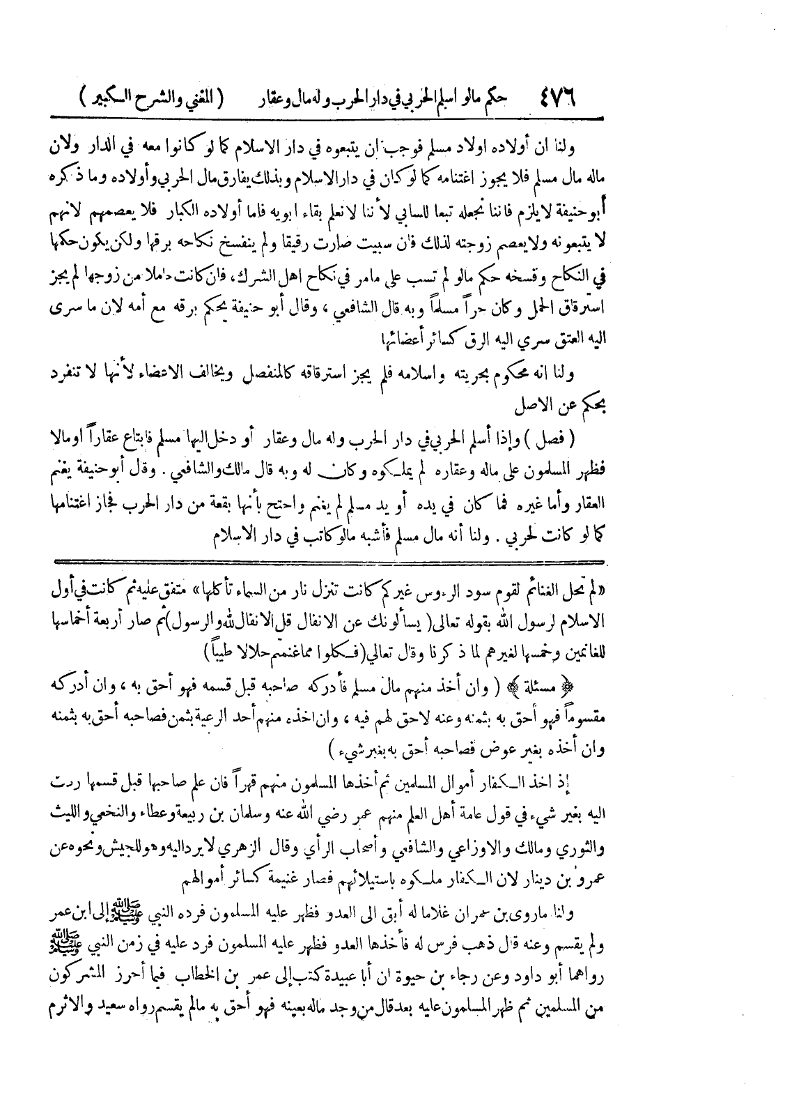 الإسلام لرسول الله بقوله تعالى (يسألونك عن الأنفال قل الأنفال لله والرسول) ثم صار أربعة أخماسها للغانمين وخمسها لغيرهم لما ذكرنا وقال تعالى (فكلوا مما غنمتم حلالا طيبا) (مسألة) (وإن أخذ منهم مال مسلم فأدركه صاحبه قبل قسمه فهو أحق به، وإن أدركه مقسوماً فهو أحق به بثمنه وعنه لا حق لهم فيه، وإن أخذه منهم أحد الرعية بثمن فصاحبه أحق به بثمنه وإن أخذه بغير عوض فصاحبه أحق به بغير شئ) إذا أخذ الكفار أموال المسلمين ثم أخذها المسلمون منهم قهراً فإن علم صاحبها قبل قسمها ردت إليه بغير شئ في قول عامة أهل العلم منهم عمر رضي الله عنه وسلمان بن ربيعة وعطاء والنخعي والليث والثوري ومالك والاوزاعي والشافعي وأصحاب الرأي وقال الزهري لا يرد إليه وهو للجيش ونحوه عن عمرو بن دينار لأن الكفار ملكوه باستيلائهم فصار غنيمة كسائر أموالهم ولنا ما روى بن عمران غلاماً له أبق إلى العدو فظهر عليه المسلمون فرده النبي صلى الله عليه وسلم الى ابن عمر ولم يقسم وعنه قال ذهب فرس له فأخذها العدو فظهر عليه المسلمون فرد عليه في زمن النبي صلى الله عليه وسلم رواهما أبو داود وعن رجاء بن حيوة أن أبا عبيدة كتب إلى عمر بن الخطاب فيما أحرز المشركون من المسلمين ثم ظهر المسلمون عليه بعد قال من وجد ماله بعينه فهو أحق به ما لم يقسم رواه سعيد والاثرم