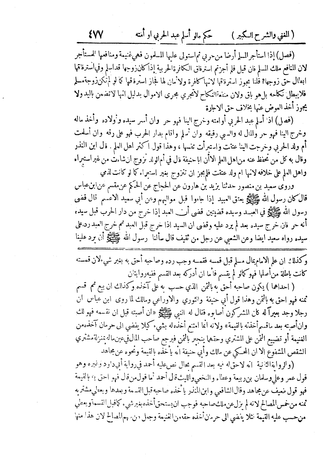 وكذلك إن علم الإمام بمال مسلم قبل قسمه فقسمه وجب رده وصاحبه أحق به بغير شئ لأن قسمته كانت باطلة من أصلها فهو كما لو لم يقسم فأما إن أدركه بعد القسم ففيه روايتان (إحداهما) يكون صاحبه أحق به بالثمن الذي حسب به على آخذه وكذلك إن بيع ثم قسم ثمنه فهو أحق به بالثمن وهذا قول أبي حنيفة والثوري والاوزاعي ومالك لما روى ابن عباس أن رجلا وجد بعيراً له كان المشركون أصابوه فقال له النبي صلى الله عليه وسلم (إن أصبته قبل أن نقسمه فهو لك وإن أصبته بعد ما قسم أخذته بالقيمة) ولأنه إنما امتنع أخذه له بشئ كيلا يفضي إلى حرمان آخذه من الغنيمة أو تضييع الثمن على المشتري وحقهما ينجبر بالثمن فيرجع صاحب المال في عين ماله بمنزلة مشتري الشقص المشفوع إلا أن المحكي عن مالك وأبي حنيفة أنه يأخذه بالقيمة ونحوه عن مجاهد