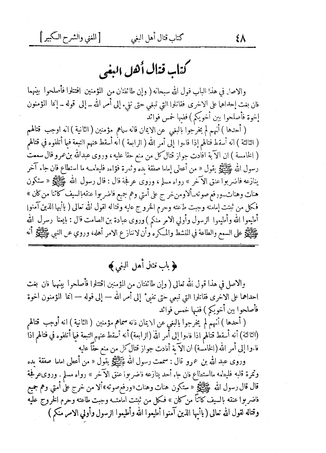 (باب قتال أهل البغي) والاصل في هذا قول الله تعالى (وإن طائفتان من المؤمنين اقتتلوا فأصلحوا بينهما فإن بغت إحداهما على الأخرى فقاتلوا التي تبغي حتى تفئ إلى أمر الله - إلى قوله - إنما المؤمنون إخوة فأصلحوا بين أخويكم) ففيها خمس فوائد (أحدها) أنهم لم يخرجوا بالبغي عن الإيمان فانه سماهم مؤمنين (الثانية) أنه أوجب قتالهم (الثالثة) أنه أسقط قتالهم اذا فاءوا الى أمر الله (الرابعة) أنه أسقط عنهم التبعة فيما أتلفوه في قتالهم اذا فاءوا إلى أمر الله (الخامسة) ان الآية أفادت جواز قتال كل من منع حقاً عليه وروى عبد الله بن عمرو قال: سمعت رسول الله صلى الله عليه وسلم يقول (من أعطى اماما صفقة يده وثمرة قبله فليطعه ما استطاع فان جاء أحد ينازعه فاضربوا عنق الآخر) رواه مسلم.