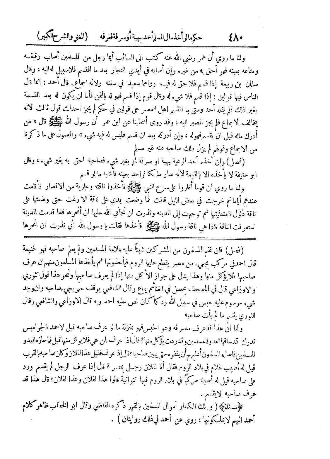 (فصل) فإن غنم المسلمون من المشركين شيئاً عليه علامة المسلمين ولم يعلم صاحبه فهو غنيمة قال أحمد في مركب يجئ من مصر يقطع عليها الروم فيأخذونها ثم يأخذها المسلمون منهم إن عرف صاحبها فلا يؤكل منها وهذا يدل على جواز الأكل منها إذا لم يعرف صاحبها ونحو هذا قول الثوري والاوزاعي قال في المصحف يحصل في الغنائم يباع وقال الشافعي يوقف حتى يجئ صاحبه وإن وجد شئ موسوم عليه حبس في سبيل الله رد كما كان نص عليه أحمد وبه قال الأوزاعي والشافعي وقال الثوري يقسم ما لم يأت صاحبه ولنا أن هذا قد عرف هذا مصرفه وهو الحبس فهو بمنزلة مالو عرف صاحبه قيل لأحمد فالجواميس تدرك قد ساقها العدو للمسلمين وقد ردت يؤكل منها؟ قال إذا عرف لمن هي فلا يوكل منها قيل فما حازه العدو للمسلمين فأصابه المسلمون أعليهم أن يقفوه حتى يبين صاحبه؟ قال إذا عرف فقيل هذا لفلان وكان صاحبه بالقرب