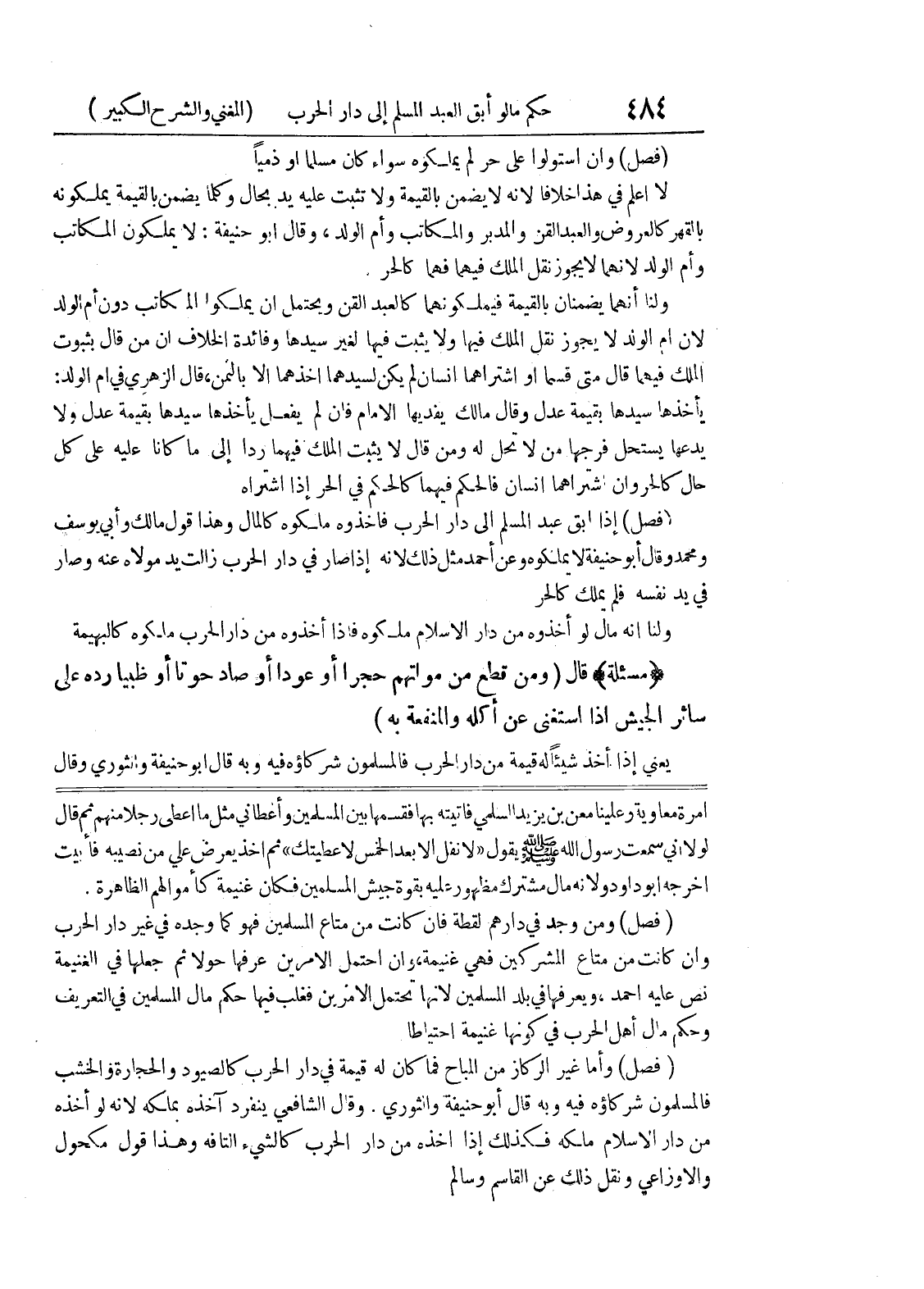 (فصل) ومن وجد في دارهم لقطة فإن كانت من متاع المسلمين فهو كما وجده في غير دار الحرب وإن كانت من متاع المشركين فهي غنيمة، وإن احتمل الأمرين عرفها حولا ثم جعلها في الغنيمة نص عليه أحمد، ويعرفها في بلد المسلمين لأنها تحتمل الأمرين فغلب فيها حكم مال المسلمين في التعريف وحكم مال أهل الحرب في كونها غنيمة احتياطاً (فصل) وأما غير الركاز من المباح فما كان له قيمة في دار الحرب كالصيود والحجارة والخشب فالمسلمون شركاؤه فيه وبه قال أبو حنيفة والثوري.