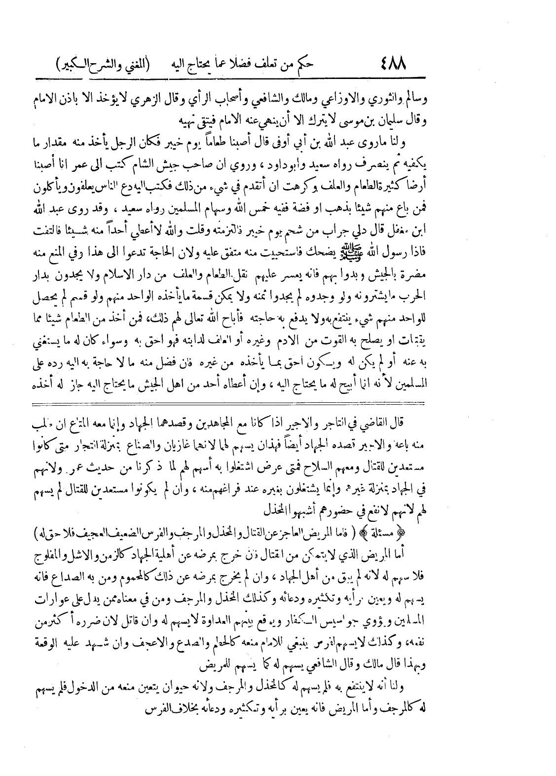 لهم لأنهم لا نفع في حضورهم أشبهوا المخذل (مسألة) (فأما المريض العاجز عن القتال والمخذل والمرجف والفرس الضعيف العجيف فلا حق له) أما المريض الذي لا يتمكن من القتال فإن خرج بمرضه عن أهلية الجهاد كالزمن والأشل والمفلوج فلا سهم له لأنه لم يبق من أهل الجهاد، وإن لم يخرج بمرضه عن ذلك كالمحموم ومن به الصداع فإنه يسهم له ويعين برأيه وتكثيره ودعائه وكذلك المخذل والمرجف ومن في معناه ممن يدل على عوارات المسلمين وبؤوي جواسيس الكفار ويوقع بينهم العداوة لا يسهم له وإن قاتل لأن ضرره أكثر من نفعه، وكذلك لا يسهم لفرس ينبغي للإمام منعه كالحطم والصدع والأعجف وإن شهد عليه الوقعة وبهذا قال مالك وقال الشافعي يسهم له كما يسهم للمريض ولنا أنه لا ينتفع به فلم يسهم له كالمخذل والمرجف ولأنه حيوان يتعين منعه من الدخول فلم يسهم له كالمرجف وأما المريض فإنه يعين برأيه وتكثيره ودعائه بخلاف الفرس