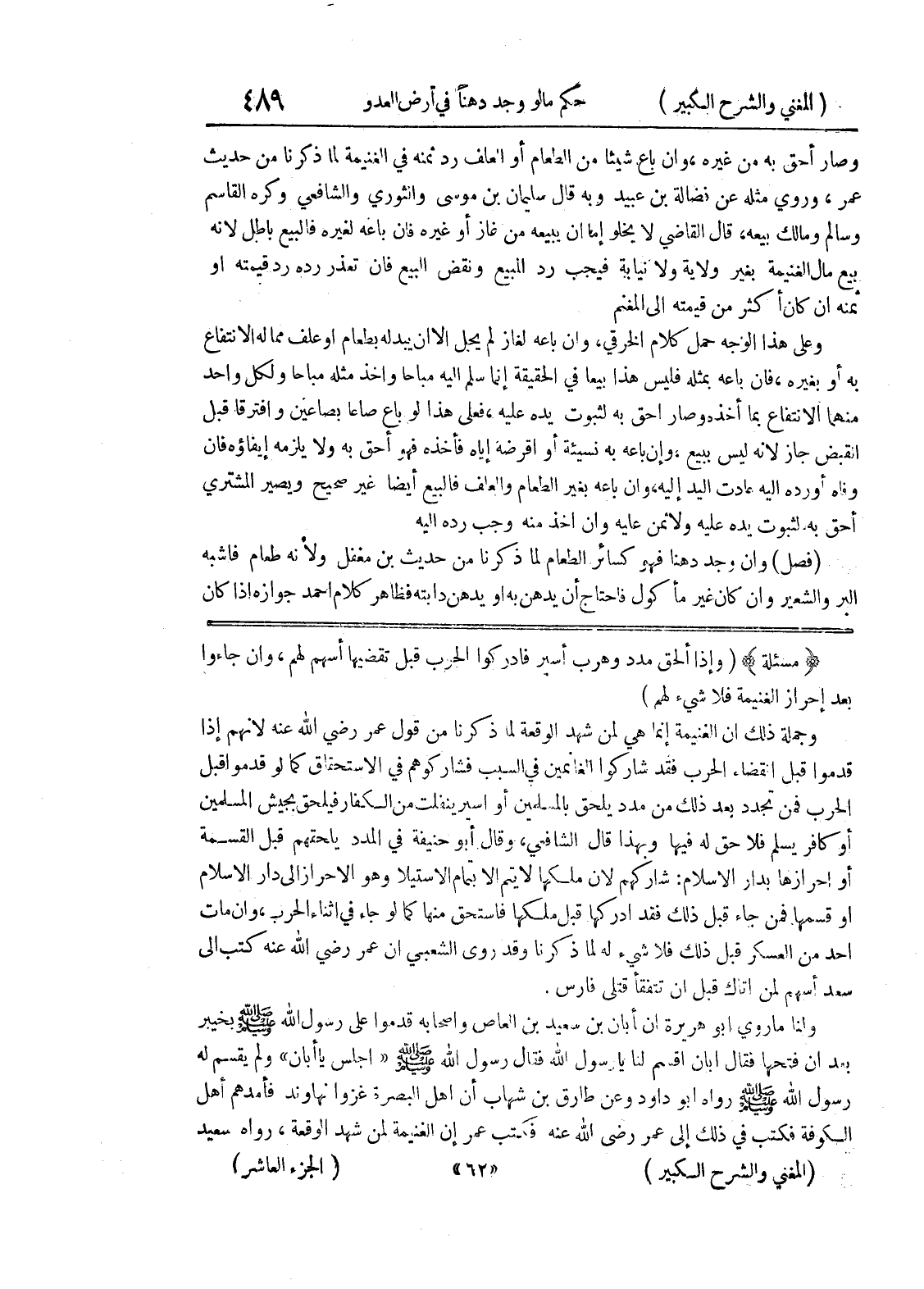 بعد أن فتحها فقال أبان أقسم لنا يا رسول الله فقال رسول الله صلى الله عليه وسلم (اجلس يا أبان) ولم يقسم له رسول الله صلى الله عليه وسلم رواه أبو داود وعن طارق بن شهاب أن أهل البصرة غزوا نهاوند فأمدهم أهل الكوفة فكتب في ذلك الى عمر رضي الله عنه فكتب عمر أن الغنيمة لمن شهد الوقعة، رواه سعيد