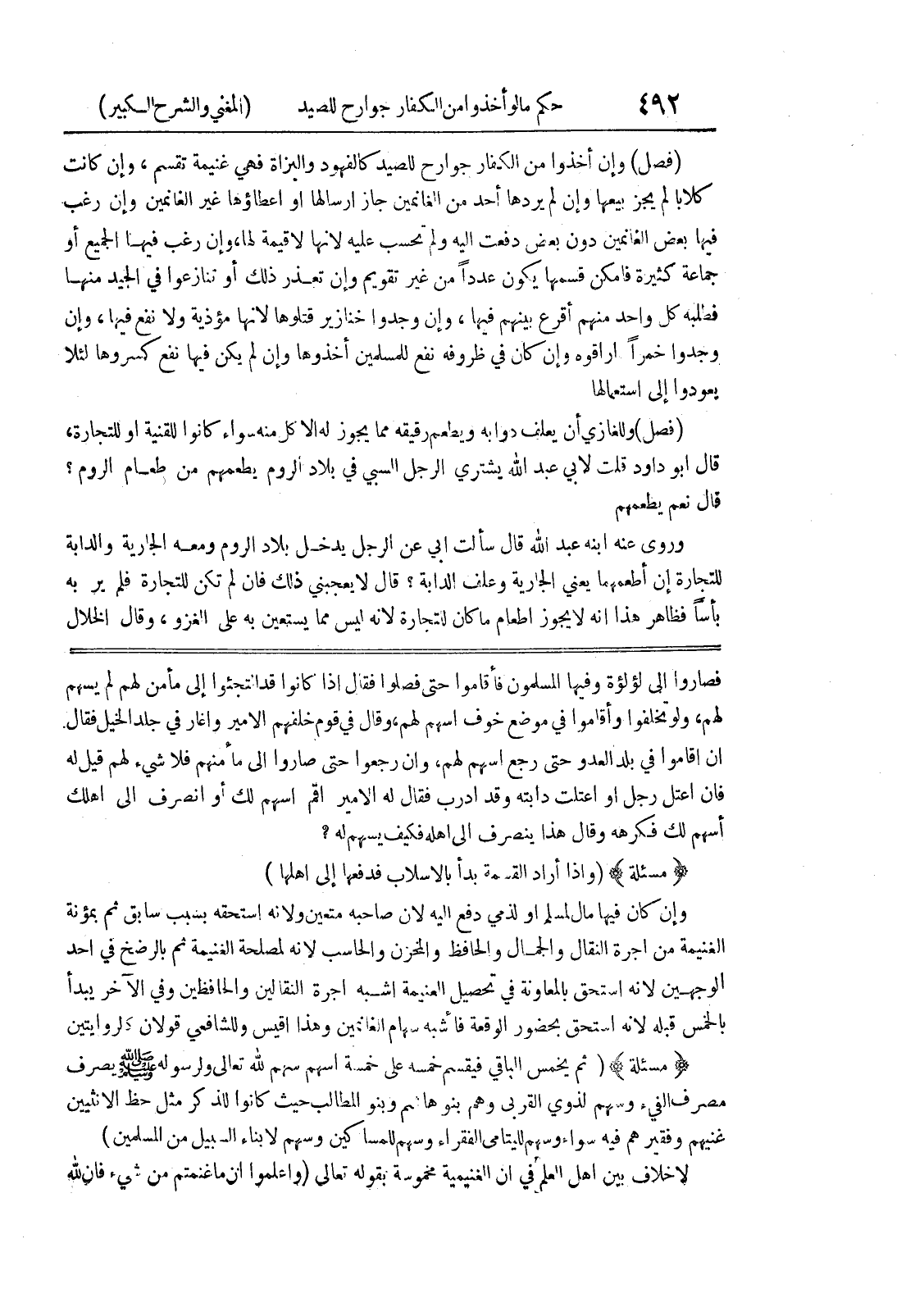 فصاروا إلى لؤلؤة وفيها المسلمون فأقاموا حتى فصلوا فقال إذا كانوا قد التجئوا إلى مأمن لهم لم يسهم لهم، ولو تخلفوا وأقاموا في موضع خوف أسهم لهم، وقال في قوم خلفهم الأمير وأغار في جلد الخيل فقال إن أقاموا في بلد العدو حتى رجع أسهم لهم، وإن رجعوا حتى صاروا إلى مأمنهم فلا شئ لهم قيل له فإن اعتل رجل أو اعتلت دابته وقد أدرب فقال له الأمير أقم أسهم لك أو انصرف إلى أهلك أسهم لك فكرهه وقال هذا ينصرف إلى أهله فكيف يسهم له؟ (مسألة) (وإذا أراد القسمة بدأ بالأسلاب فدفعها إلى أهلها) وإن كان فيها مال لمسلم أو لذمي دفع إليه لأن صاحبه متعين ولأنه استحقه بسبب سابق ثم بمؤنة الغنيمة من أجرة النقال والجمال والحافظ والمخزن والحاسب لأنه لمصلحة الغنيمة ثم بالرضخ في أحد الوجهين لانه استحق بالمعاونة في تحصيل الغنيمة أشبه أجرة النقالين والحافظين في الآخر يبدأ