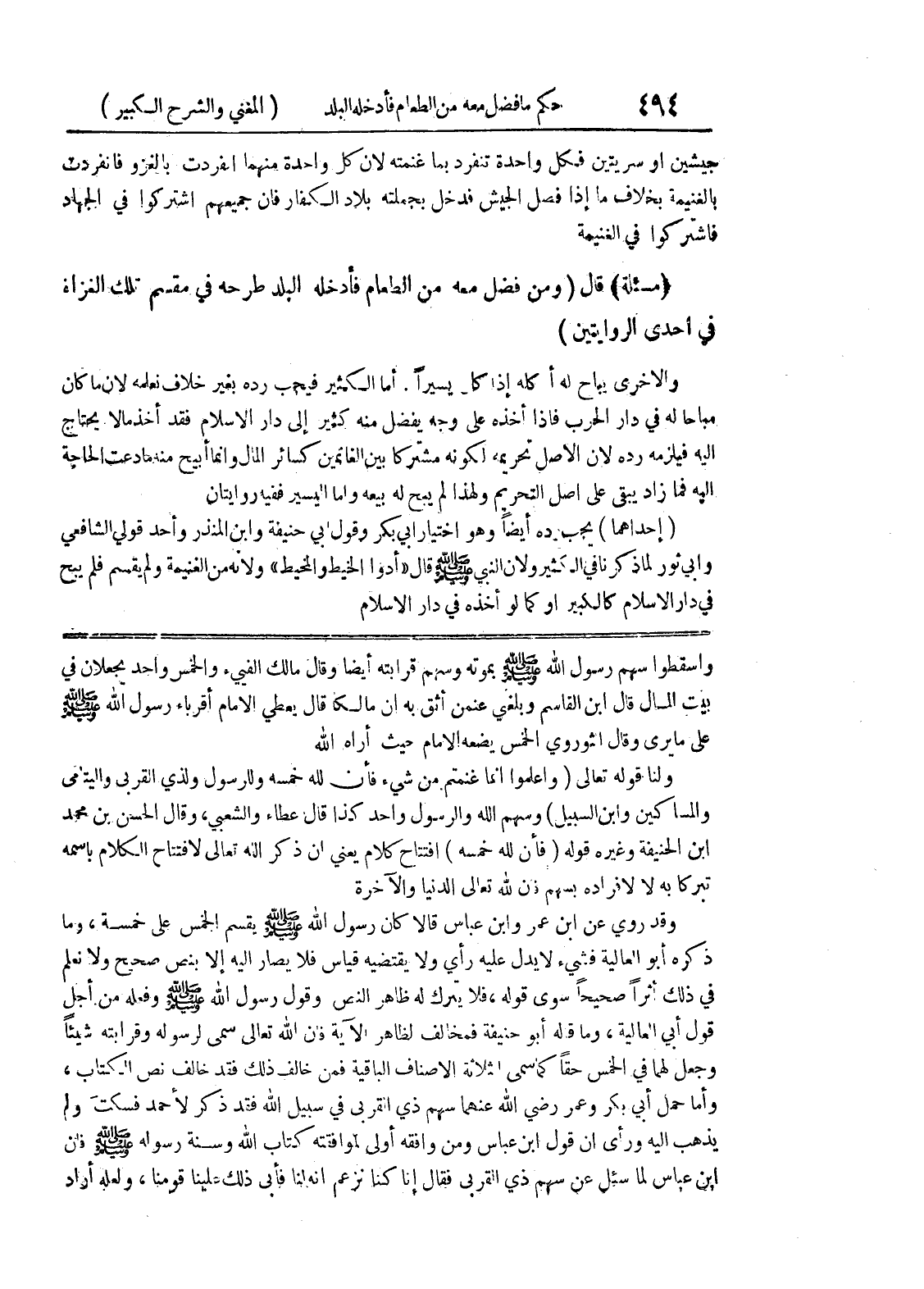 واسقطوا سهم رسول الله صلى الله عليه وسلم بموته وسهم قرابته أيضا وقال مالك الفيئ والخمس واحد يجعلان في بيت المال قال ابن القاسم وبلغني عن من أثق به أن مالكاً قال يعطي الإمام أقرباء رسول الله صلى الله عليه وسلم على ما يرى وقال الثوروي الخمس يضعه الإمام حيث أراه الله ولنا قوله تعالى (واعلموا أنما غنمتم من شئ فأن لله خمسه وللرسول ولذي القربى واليتامى والمساكين وابن السبيل) وسهم الله والرسول واحد كذا قال عطاء والشعبي، وقال الحسن بن محمد ابن الحنيفة وغيره قوله (فأن لله خمسه) افتتاح كلام يعني أن ذكر الله تعالى لافتتاح الكلام باسمه تبركا به لا لافراده بسهم فإن لله تعالى الدنيا والآخرة وقد روي عن ابن عمر وابن عباس قالا كان رسول الله صلى الله عليه وسلم يقسم الخمس على خمسة، وما ذكره أبو العالية فشئ لا يدل عليه رأي ولا يقتضيه قياس فلا يصار إليه إلا بنص صحيح ولا نعلم في ذلك أثراً صحيحاً سوى قوله، فلا يترك له ظاهر النص وقول رسول الله صلى الله عليه وسلم وفعله من أجل قول أبي العالية، وما قاله أبو حنيفة فمخالف لظاهر الآية فإن الله تعالى سمى لرسوله وقرابته شيئاً وجعل لهما في الخمس حقاً كما سمى الثلاثة الأصناف الباقية فمن خالف ذلك فقد خالف نص الكتاب، وأما حمل ابي بكر وعمر رضي الله عنهما سهم ذي القربى في سبيل الله فقد ذكر لأحمد فسكت ولم يذهب إليه ورأى أن قول ابن عباس ومن وافقه أولى لموافقته كتاب الله وسنة رسوله الله صلى الله عليه وسلم فإن ابن عباس لما سئل عن سهم ذي القربى فقال إنا كنا نزعم أنه لنا فأبى ذلك علينا قومنا، ولعله أراد