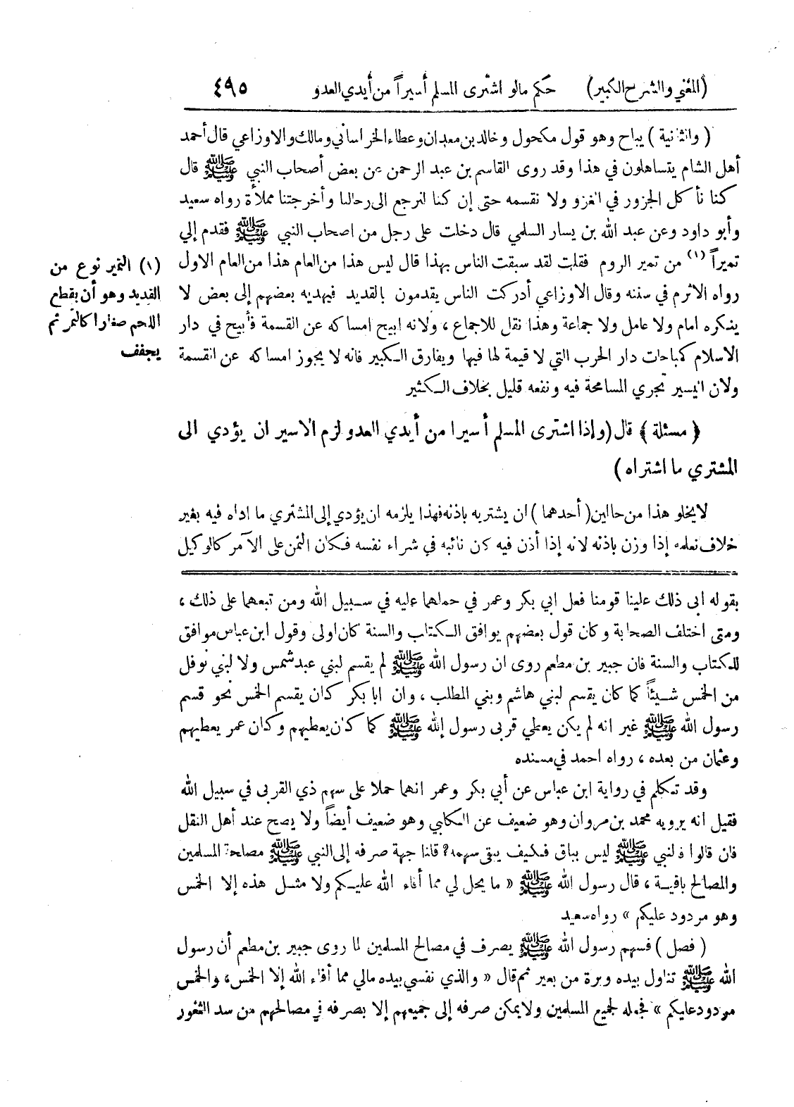 وعثمان من بعده، رواه أحمد في مسنده وقد تكلم في رواية ابن عباس عن أبي بكر وعمر أنهما حملا على سهم ذي القربى في سبيل الله فقيل إنه يرويه محمد بن مروان وهو ضعيف عن الكلبي وهو ضعيف أيضاً ولا يصح عند أهل النقل فإن قالوا فالنبي صلى الله عليه وسلم ليس بباق فكيف يبقى سهمه؟ قلنا جهة صرفه إلى النبي صلى الله عليه وسلم مصلحة المسلمين والمصالح باقية، قال رسول الله صلى الله عليه وسلم (ما يحل لي مما أفاء الله عليكم ولا مثل هذه إلا الخمس وهو مردود عليكم) رواه سعيد (فصل) فسهم رسول الله صلى الله عليه وسلم يصرف في مصالح المسلمين لما روى جبير بن مطعم أن رسول الله صلى الله عليه وسلم تناول بيده وبرة من بعير ثم قال (والذي نفسي بيده مالي مما أفاء الله إلا الخمس، والخمس مردود عليكم) فجعله لجميع المسلمين ولا يمكن صرفه إلى جميعهم إلا بصرفه في مصالحهم من سد الثغور