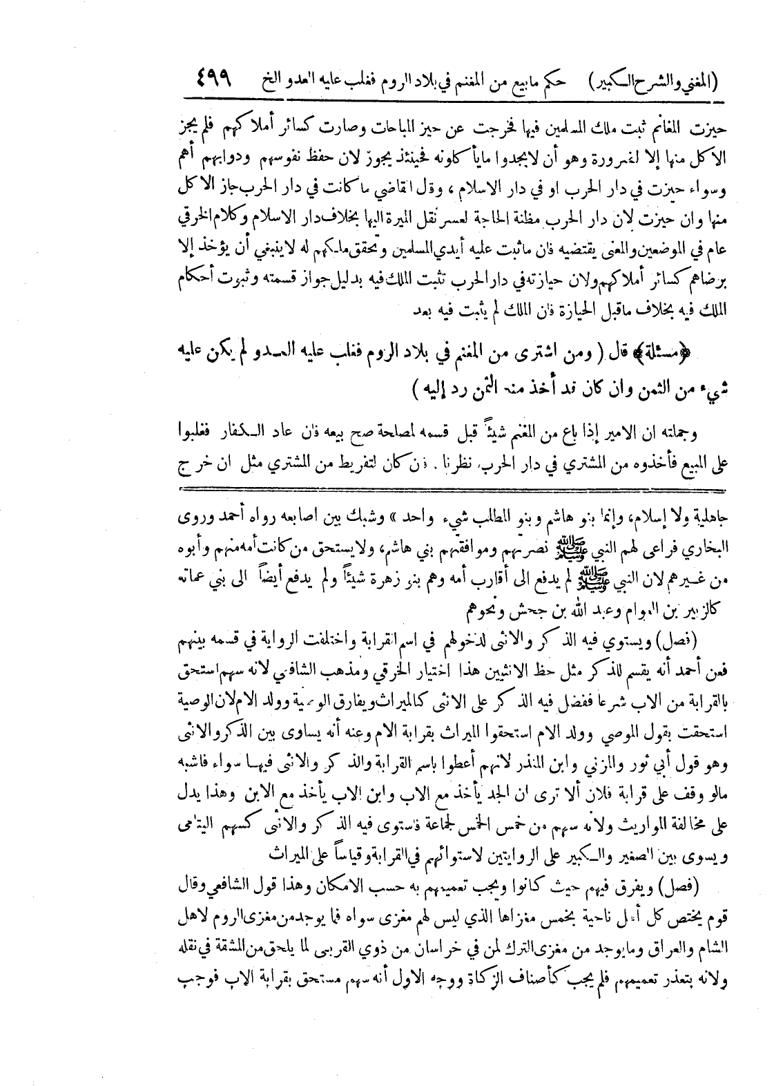 جاهلية ولا إسلام، وإنما بنو هاشم وبنو المطلب شئ واحد) وشبك بين أصابعه رواه أحمد وروى البخاري فراعى لهم النبي صلى الله عليه وسلم نصرتهم وموافقتهم بني هاشم، ولا يستحق من كانت أمه منهم وأبوه من غيرهم لأن النبي صلى الله عليه وسلم لم يدفع إلى أقارب أمه وهو بنو زهرة شيئاً ولم يدفع أيضاً إلى بني عماته كالزبير بن العوام وعبد الله بن جحش ونحوهم (فصل) ويستوي فيه الذكر والأنثى لدخولهم في اسم القرابة واختلفت الرواية في قسمه بينهم فعن أحمد أنه يقسم للذكر مثل حظ الأنثيين هذا اختيار الخرقي ومذهب الشافعي لأنه سهم استحق بالقرابة من الأب شرعاً ففضل فيه الذكر على الأنثى كالميراث ويفارق الوصية وولد الأم لأن الوصية استحقت بقول الموصي وولد الأم استحقوا الميراث بقرابة الأم وعنه أنه يساوي بين الذكر والأنثى وهو قول أبي ثور والمزني وابن المنذر لأنهم أعطوا باسم القرابة والذكر والأنثى فيها سواء فاشبه مالو وقف على قرابة فلان الا ترى أن الجد يأخذ مع الأب وابن الأب يأخذ مع الابن وهذا يدل على مخالفة المواريث ولأنه سهم من خمس الخمس لجماعة فاستوى فيه الذكر والأنثى كسهم اليتامى ويسوى بين الصغير والكبير على الروايتين لاستوائهم في القرابة وقياساً على الميراث (فصل) ويفرق فيهم حيث كانوا ويجب تعميمهم به حسب الإمكان وهذا قول الشافعي وقال