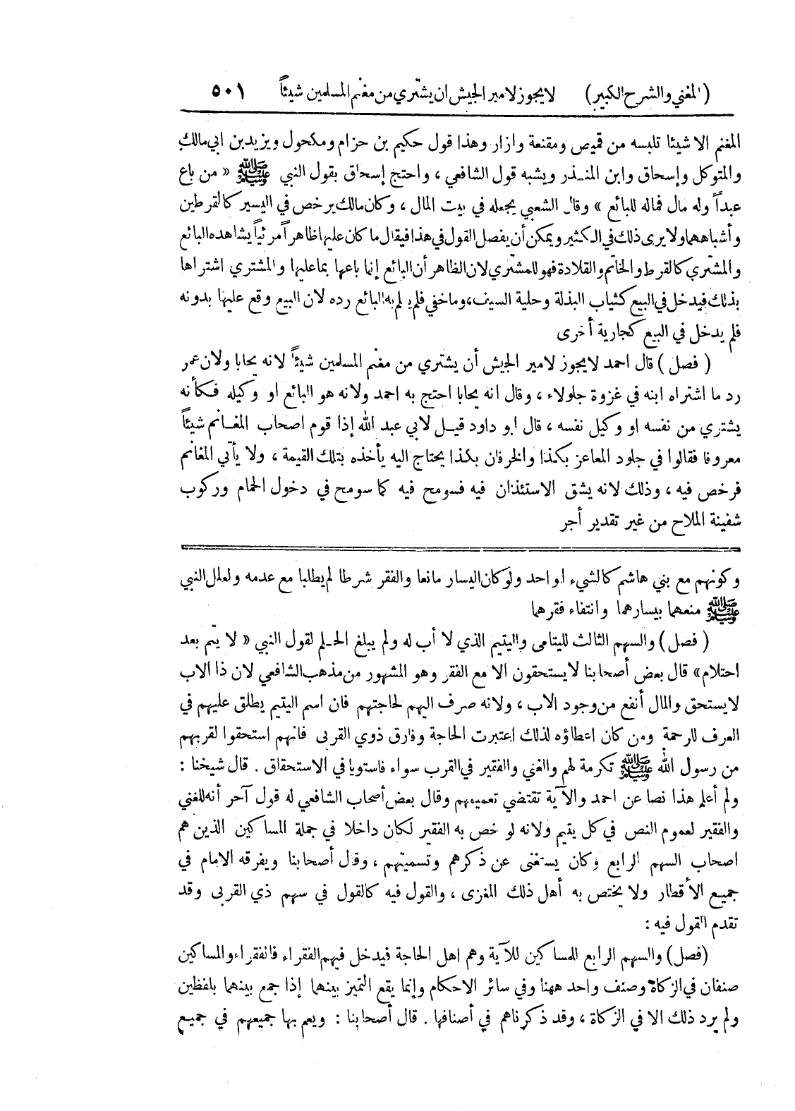 قال شيخنا: ولم أعلم هذا نصاً عن أحمد والآية تقتضي تعميمهم وقال بعض أصحاب الشافعي له قول آحر أنه للغني والفقير لعموم النص في كل يتيم ولأنه لو خص به الفقير لكان داخلاً في جملة المساكين الذين هم أصحاب السهم الرابع وكان يستغني عن ذكرهم وتسميتهم، وقال أصحابنا ويفرقه الإمام في جميع الأقطار ولا يختص به أهل ذلك المغزى، والقول فيه كالقول في سهم ذي القربى وقد تقدم القول فيه: (فصل) والسهم الرابع للمساكين للآية وهم أهل الحاجة فيدخل فيهم الفقراء فالفقراء والمساكين صنفان في الزكاة وصنف واحد ههنا وفي سائر الأحكام وإنما يقع التميز بينهما إذا جمع بينهما بلفظين ولم يرد ذلك إلا في الزكاة، وقد ذكرناهم في اصنافها.