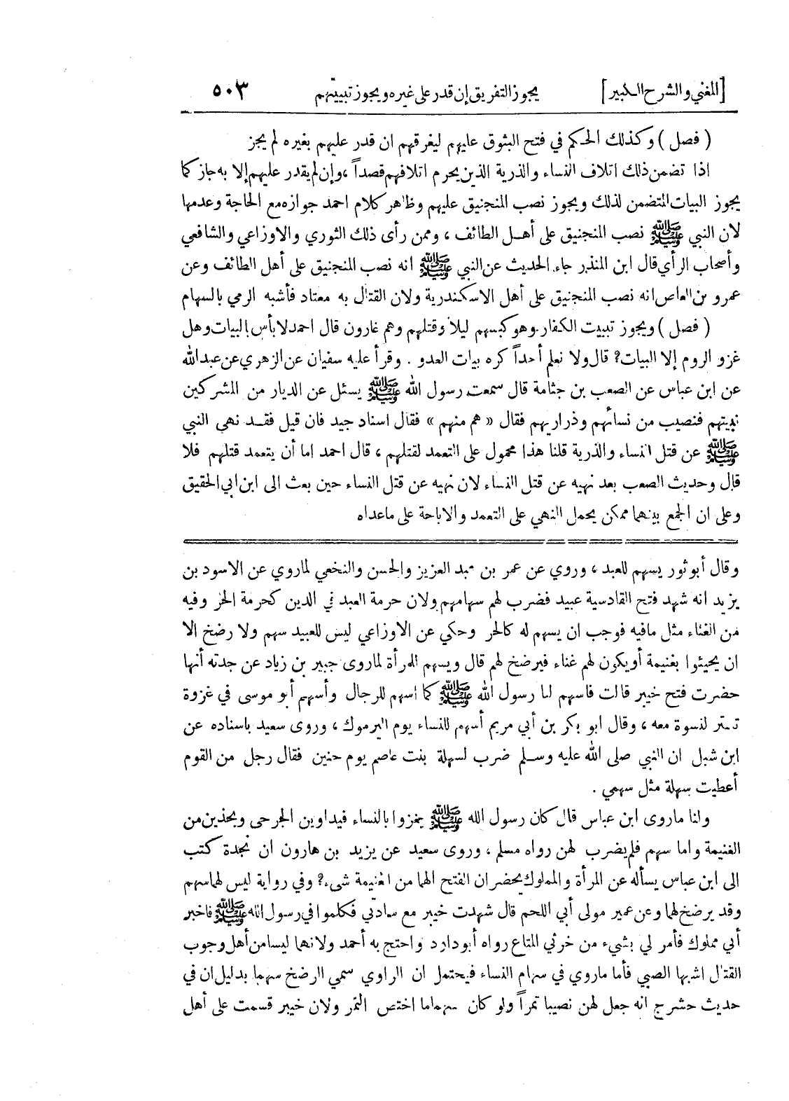ولنا ماروى ابن عباس قال كان رسول الله صلى الله عليه وسلم يغزوا بالنساء فيداوين الجرحى ويحذين من الغنيمة وأما سهم فلم يضرب لهن رواه مسلم، وروى سعيد عن يزيد بن هارون أن نجدة كتب إلى ابن عباس يسأله عن المرأة والمملوك يحضران الفتح ألهما من الغنيمة شئ؟ وفي رواية ليس لهما سهم وقد يرضخ لهما وعن عمير مولى أبي اللحم قال شهدت خيبر مع سادتي فكلموا في رسول الله صلى الله عليه وسلم فأخبر أبي مملوك فأمر لي بشئ من خرثي المتاع رواه أبو داود واحتج به أحمد ولانهما ليسا من أهل وجوب القتال أشبها الصبي فأما ما روي في سهام النساء فيحتمل أن الراوي سمى الرضخ سهما بدليل أن في حديث حشرج أنه جعل لهن نصيباً تمراً ولو كان سهما ما اختص التمر ولأن خيبر قسمت على أهل