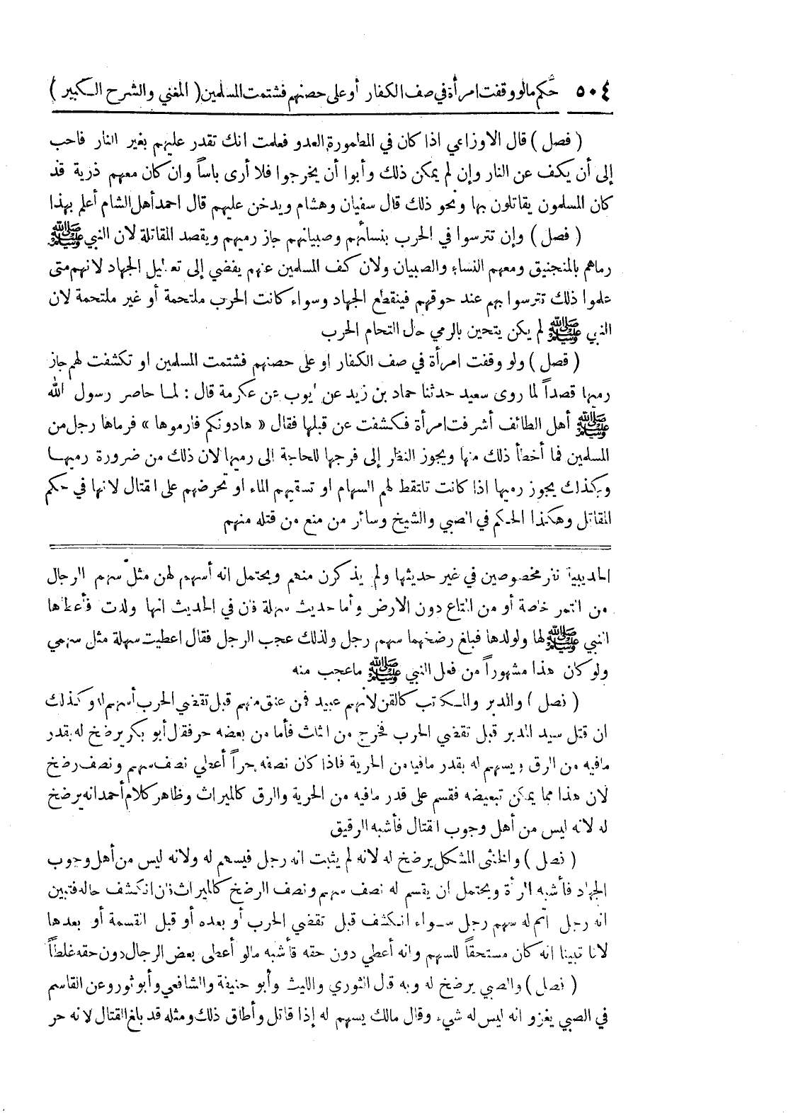 الحديبية نفر مخصوصين في غير حديثها ولم يذكرن منهم ويحتمل أنه أسهم لهن مثل سهم الرجال من التمر خاصة أو من المتاع دون الأرض وأما حديث سهلة فإن في الحديث أنها ولدت فأعطاها النبي صلى الله عليه وسلم لها ولولدها فبلغ رضخهما سهم رجل ولذلك عجب الرجل فقال أعطيت سهلة مثل سهمي ولو كان هذا مشهورا من فعل النبي صلى الله عليه وسلم ما عجب منه (فصل) والمدبر والمكاتب كالقن لأنهم عبيد فمن عتق منهم قبل تقضي الحرب أسهم له وكذلك إن قتل سيد المدبر قبل تقضي الحرب فخرج من الثلث فأما من بعضه حر فقال أبو بكر يرضخ له بقدر ما فيه من الرق ويسهم له بقدر ما فيه من الحرية فإذا كان نصفه حرا أعطي نصف سهم ونصف رضخ لأن هذا مما يمكن تبعيضه فقسم على قدر ما فيه من الحرية والرق كالميراث وظاهر كلام أحمد أنه يرضخ له لأنه ليس من أهل وجوب القتال فأشبه الرقيق (فصل) والخنثى المشكل يرضخ له لأنه لم يثبت أنه رجل فيسهم له ولأنه ليس من أهل وجوب الجهاد فأشبه المرأة ويحتمل أن يقسم له نصف سهم ونصف الرضخ كالميراث فإن انكشف حالة فتبين أنه رجل أتم له سهم رجل سواء انكشف قبل تقضي الحرب أو بعد أو قبل القسمة أو بعدها لأنا تبينا أنه كان مستحقاً للسهم وأنه أعطي دون حقه قأشبه مالو أعطى بعض الرجال دون حقه غلطاً (فصل) والصبي يرضخ له وبه قال الثوري والليث وأبو حنيفة والشافعي وأبو ثور وعن القاسم في الصبي يغزو أنه ليس له شئ وقال مالك يسهم له إذا قاتل وأطاق ذلك ومثله قد بلغ القتال لأنه حر