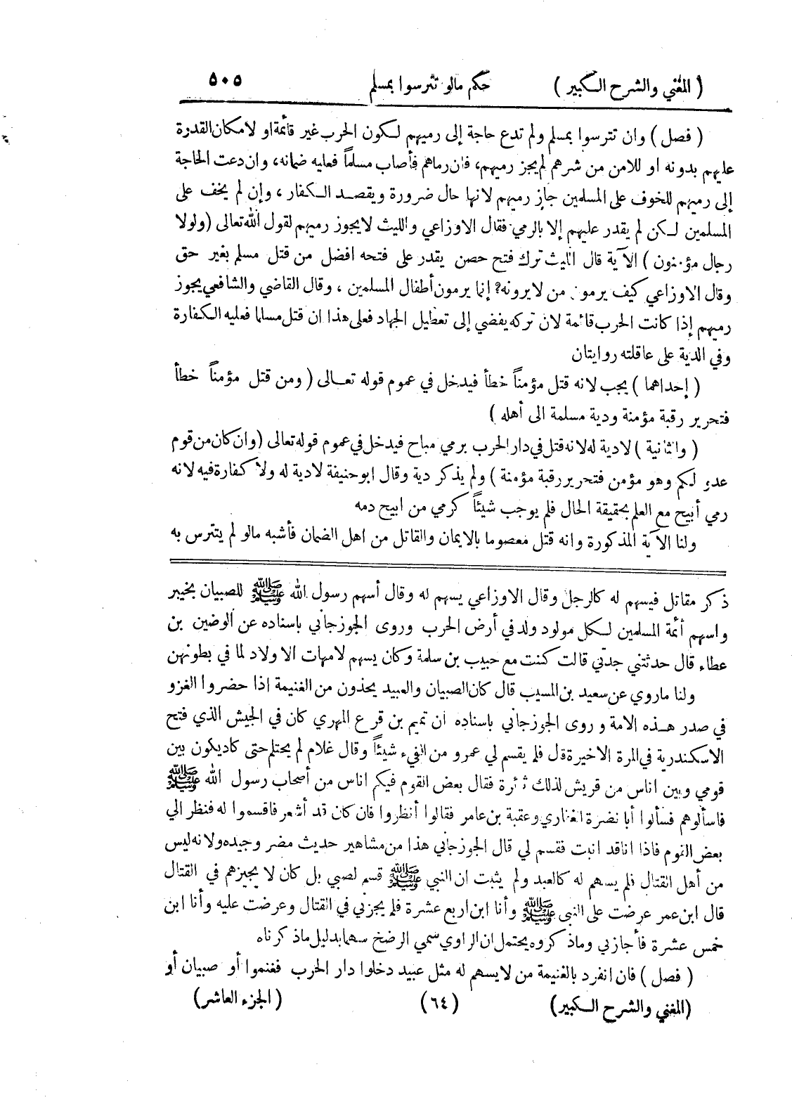 الاسكندرية في المرة الأخيرة قال فلم يقسم لي عمرو من الفئ شيئاً وقال غلام لم يحتلم حتى كاد يكون بين قومي وبين أناس من قريش لذلك ثائرة فقال بعض القوم فيكم أناس من أصحاب رسول الله صلى الله عليه وسلم فاسألوهم فسألوا أبا نضرة الغفاري وعقبة بن عامر فقالوا انظروا فإن كان قد أشعر فاقسموا له فنظر إلي بعض القوم فإذا أنا قد انبت فقسم لي قال الجوزجاني هذا من مشاهير حديث مضر وجيدة ولأنه ليس من أهل القتال فلم يسهم له كالعبد ولم يثبت أن النبي صلى الله عليه وسلم قسم لصبي بل كان لا يجيزهم في القتال قال ابن عمر عرضت على النبي صلى الله عليه وسلم وأنا ابن أربع عشرة فلم يجزني في القتال وعرضت عليه وأنا ابن خمس عشرة فأجازني وما ذكروه يحتمل أن الراوي سمى الرضخ سهما بدليل ما ذكرناه (فصل) فان انفرد بالغنيمة من لا يسهم له مثل عبيد دخلوا دار الحرب فغنموا أو صبيان أو