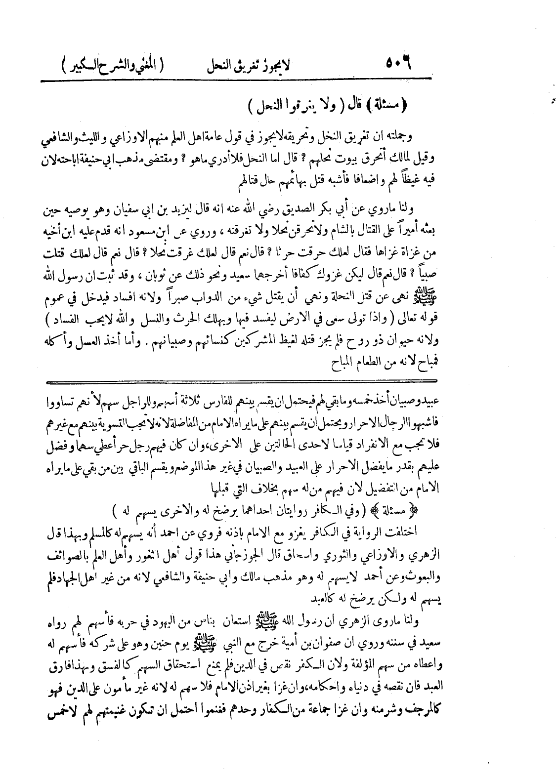 عبيد وصبيان أخذ خمسه وما بقي لهم فيحتمل أن يقسم بينهم للفارس ثلاثة أسهم وللراجل سهم لأنهم تساووا فاشبهوا الرجال الأحرار ويحتمل أن يقسم بينهم على ما يراه الإمام من المفاضلة لأنه لا تجب التسوية بينهم مع غيرهم فلا تجب مع الانفراد قياساً لاحدى الحالتين على الأخرى، وإن كان فيهم رجل حر أعطي سهما وفضل عليهم بقدر ما يفضل الأحرار على العبيد والصبيان في غير هذا الموضع ويقسم الباقي بين من بقي على ما يراه الإمام من التفضيل لان فيهم من له سهم بخلاف التي قبلها (مسألة) (وفي الكافر روايتان إحداهما يرضخ له والأخرى يسهم له) اختلفت الرواية في الكافر يغزو مع الإمام بإذنه فروي عن أحمد أنه يسهم له كالمسلم وبهذا قال الزهري والاوزاعي والثوري واسحاق قال الجوزجاني هذا قول أهل الثغور وأهل العلم بالصوائف والبعوث وعن أحمد لا يسهم له وهو مذهب مالك وابي حنيفة والشافعي لأنه من غير أهل الجهاد فلم يسهم له ولكن يرضخ له كالعبد ولنا ماروى الزهري أن رسول الله صلى الله عليه وسلم استعان بناس من اليهود في حربه فأسهم لهم رواه سعيد في سننه وروي أن صفوان بن أمية خرج مع النبي صلى الله عليه وسلم يوم حنين وهو على شركه فأسهم له وأعطاه من سهم المؤلفة ولأن الكفر نقص في الدين فلم يمنع استحقاق السهم كالفسق وبهذا فارق