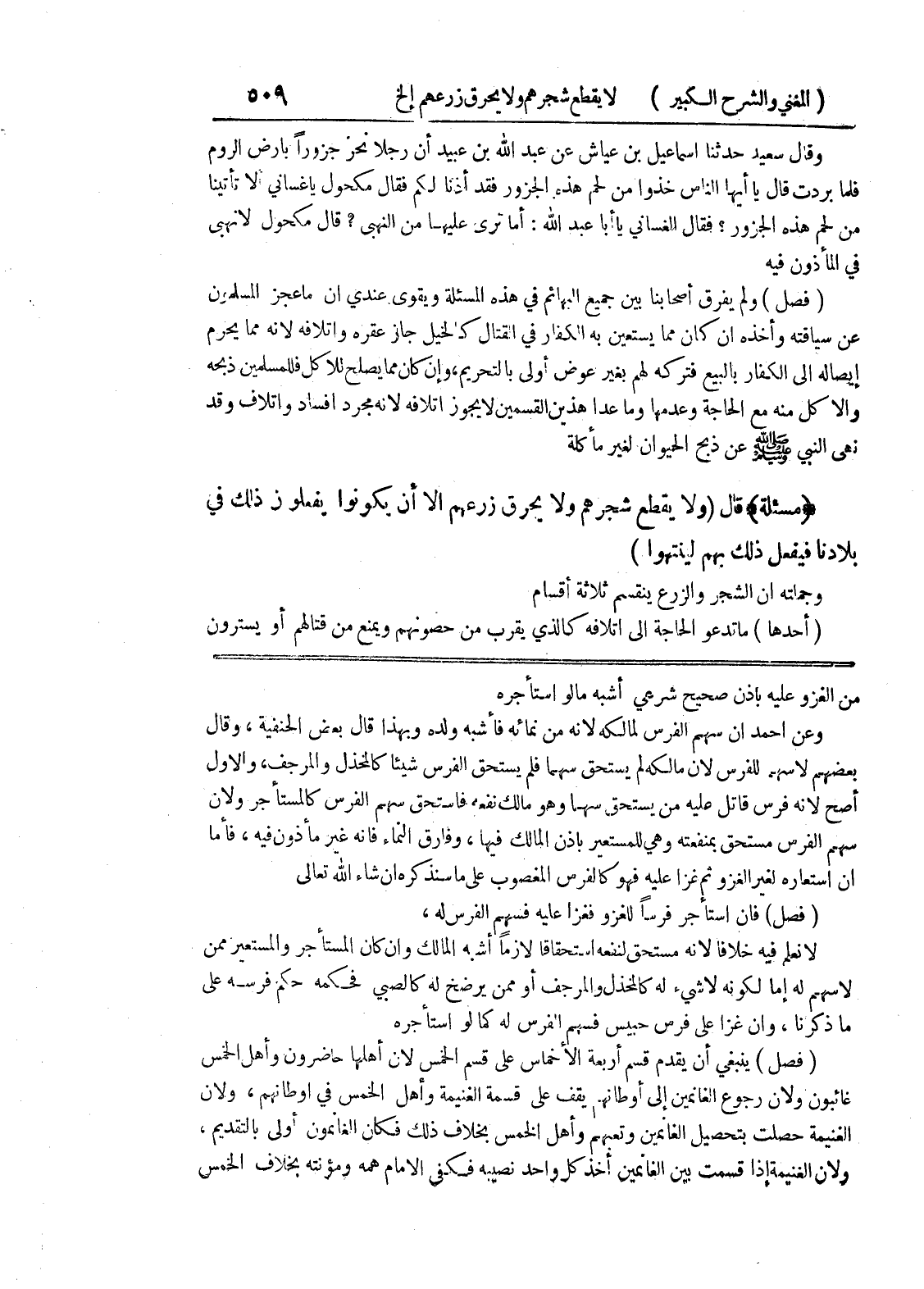 من الغزو عليه بإذن صحيح شرعي أشبه مالو استأجره وعن أحمد أن سهم الفرس لمالكه لأنه من نمائه فأشبه ولده وبهذا قال بعض الحنفية، وقال بعضهم لا سهم للفرس لأن مالكه لم يستحق سهما فلم يستحق الفرس شيئاً كالمخذل والمرجف، والأول أصح لأنه فرس قاتل عليه من يستحق سهما وهو مالك نفعه فاستحق سهم الفرس كالمستأجر ولأن سهم الفرس مستحق بمنفعته وهي للمستعير بإذن المالك فيها، وفارق النماء فإنه غير مأذون فيه، فأما إن استعاره لغير الغزو ثم غزا عليه فهو كالفرس المغصوب عليه ما سنذكره إن شاء الله تعالى (فصل) فإن استأجر فرساً للغزو فغزا عليه فسهم الفرس له، لا نعلم فيه خلافاً لأنه مستحق لنفعه استحقاقاً لازماً أشبه المالك وإن كان المستأجر والمستعير ممن لا سهم له إما لكونه لا شئ له كالمخذل والمرجف أو ممن يرضخ له كالصبي فحكمه حكم فرسه على ما ذكرنا، وإن غزا على فرس حبيس فسهم الفرس له كما لو استأجره (فصل) ينبغي أن يقدم قسم اربعة الأخماس على قسم الخمس لأن أهلها حاضرون وأهل الخمس غائبون ولأن رجوع الغانمين إلى أوطانهم يقف على قسمه الغنيمة وأهل الخمس في أوطانهم، ولأن
