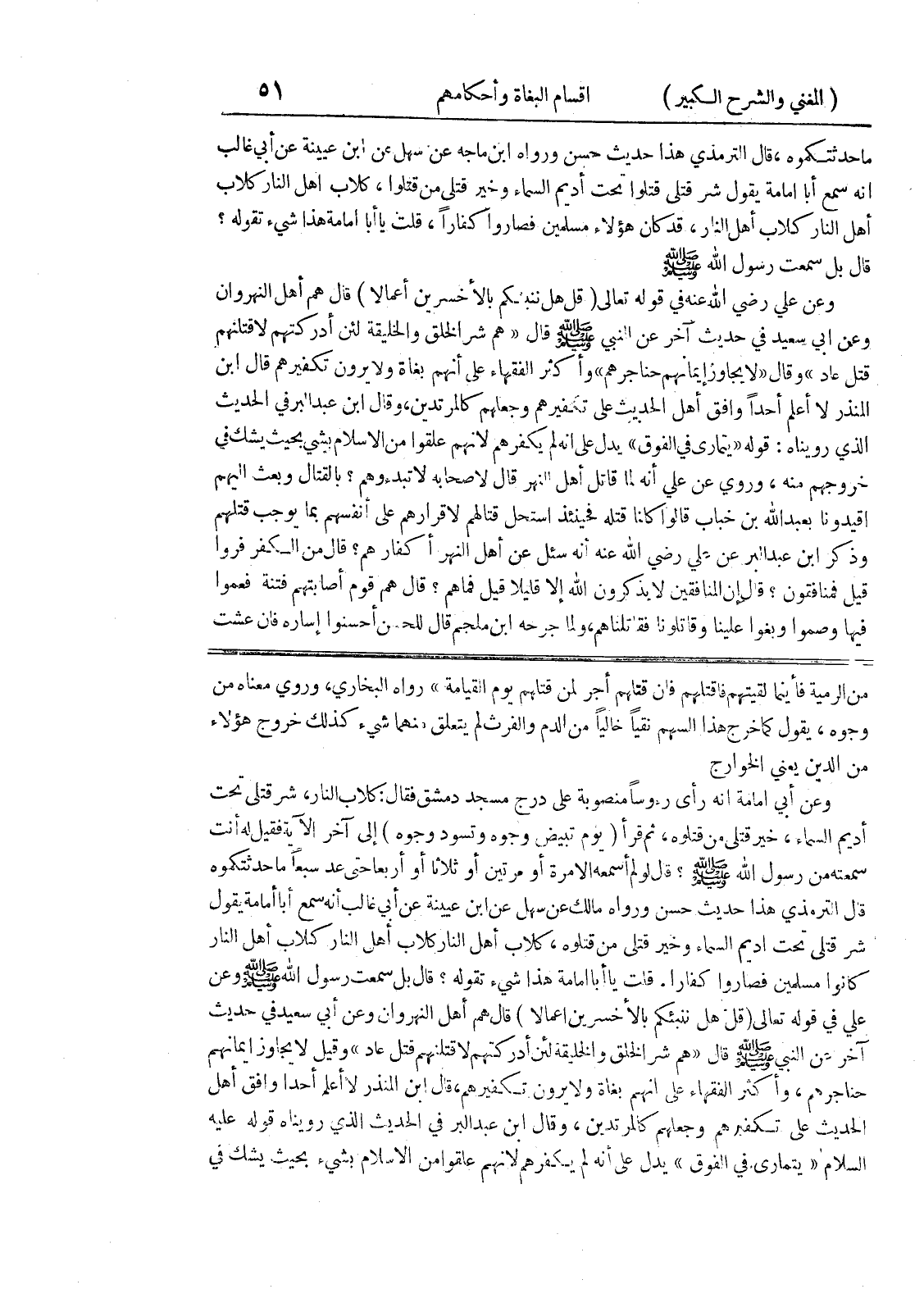 قلت يا أبا امامة هذا شئ تقوله؟ قال بل سمعت رسول الله صلى الله عليه وسلم وعن علي في قوله تعالى (قل هل ننبئكم بالأخسرين أعمالا) قال هم أهل النهروان وعن أبي سعيد في حديث آخر عن النبي صلى الله عليه وسلم قال (هم شر الخلق والخليقة لئن أدركتهم لا قتلنهم قتل عاد) وقيل لا يجاوز ايمانهم حناجرهم، وأكثر الفقهاء على أنهم بغاة ولا يرون تكفيرهم، قال إبن المنذر لا أعلم أحداً وافق أهل الحديث على تكفيرهم وجعلهم كالمرتدين، وقال ابن عبد البر في الحديث الذي رويناه قوله عليه السلام (يتمارى في الفوق) يدل على أنه لم يكفرهم لأنهم علقوا من الإسلام بشئ بحيث يشك في