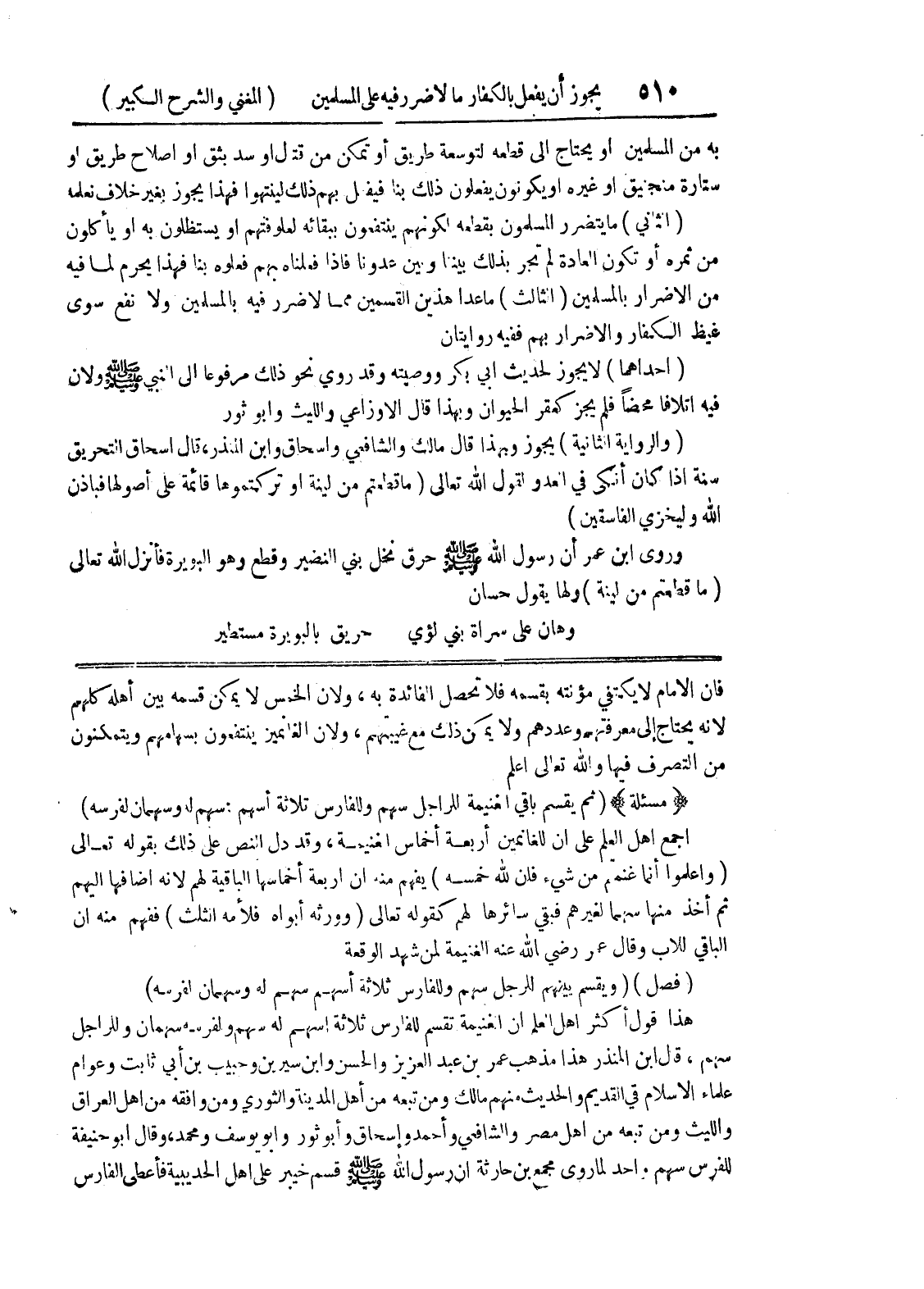 فإن الإمام لا يكتفي مؤنته بقسمه فلا تحصل الفائدة به، ولأن الخمس لا يمكن قسمه بين أهله كلهم لأنه يحتاج إلى معرفتهم وعددهم ولا يمكن ذلك مع غيبتهم، ولأن الغانمين ينتفعون بسهامهم ويتمكنون من التصرف فيها والله تعالى أعلم (مسألة) (ثم يقسم باقي الغنيمة للراجل سهم وللفارس ثلاثة أسهم سهم له وسهمان لفرسه) أجمع أهل العلم على أن للغانمين أربعة أخماس الغنيمة، وقد دل النص على ذلك بقوله تعالى (واعلموا أنما غنمتم من شئ فأن لله خمسه) يفهم منه أن أربعة أخماسها الباقية لهم لأنه أضافها إليهم ثم أخذ منها سهما لغيرهم فبقي سائرها لهم كقوله تعالى (وورثه أبواه فلأمه الثلث) ففهم منه أن الباقي للأب وقال عمر رضي الله عنه الغنيمة لمن شهد الوقعة (فصل) (ويقسم بينهم للراجل سهم وللفارس ثلاثة أسهم سهم له وسهمان لفرسه) هذا قول أكثر أهل العلم أن الغنيمة تقسم للفارس ثلاثة أسهم له سهم ولفرسه سهمان وللراجل سهم، قال إبن المنذر هذا مذهب عمر بن عبد العزيز والحسن وابن سيرين وحبيب بن أبي ثابت وعوام علماء الإسلام قي القديم والحديث منهم مالك ومن تبعه من أهل المدينة والثوري ومن وافقه من أهل العراق والليث ومن تبعه من أهل مصر والشافعي وأحمد وإسحاق وأبو ثور وأبو يوسف ومحمد، وقال أبو حنيفة للفرس سهم واحد لما روى مجمع بن حارثة أن رسول الله صلى الله عليه وسلم قسم خيبر على أهل الحديبية فأعطى الفارس